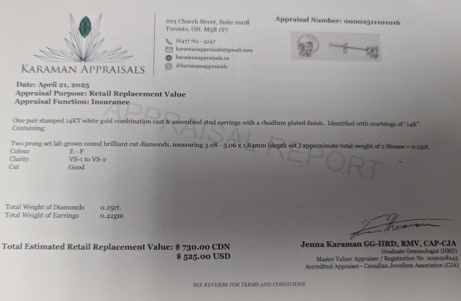 $730, 14K(0.42g), LAB DIAMOND (0.25ct)EARRING, appraised/retail value $730
