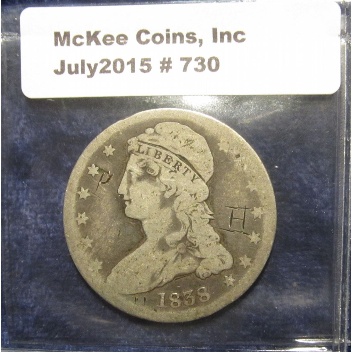 730. 1838 Capped Bust Half Dollar. Reeded edge. AG/VG. Graffiti on obverse.