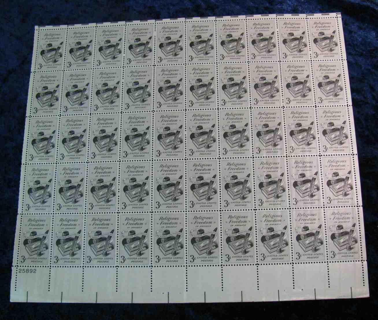 732. Original Mint Sheet of Religious Freedom in America .03c Stamps.