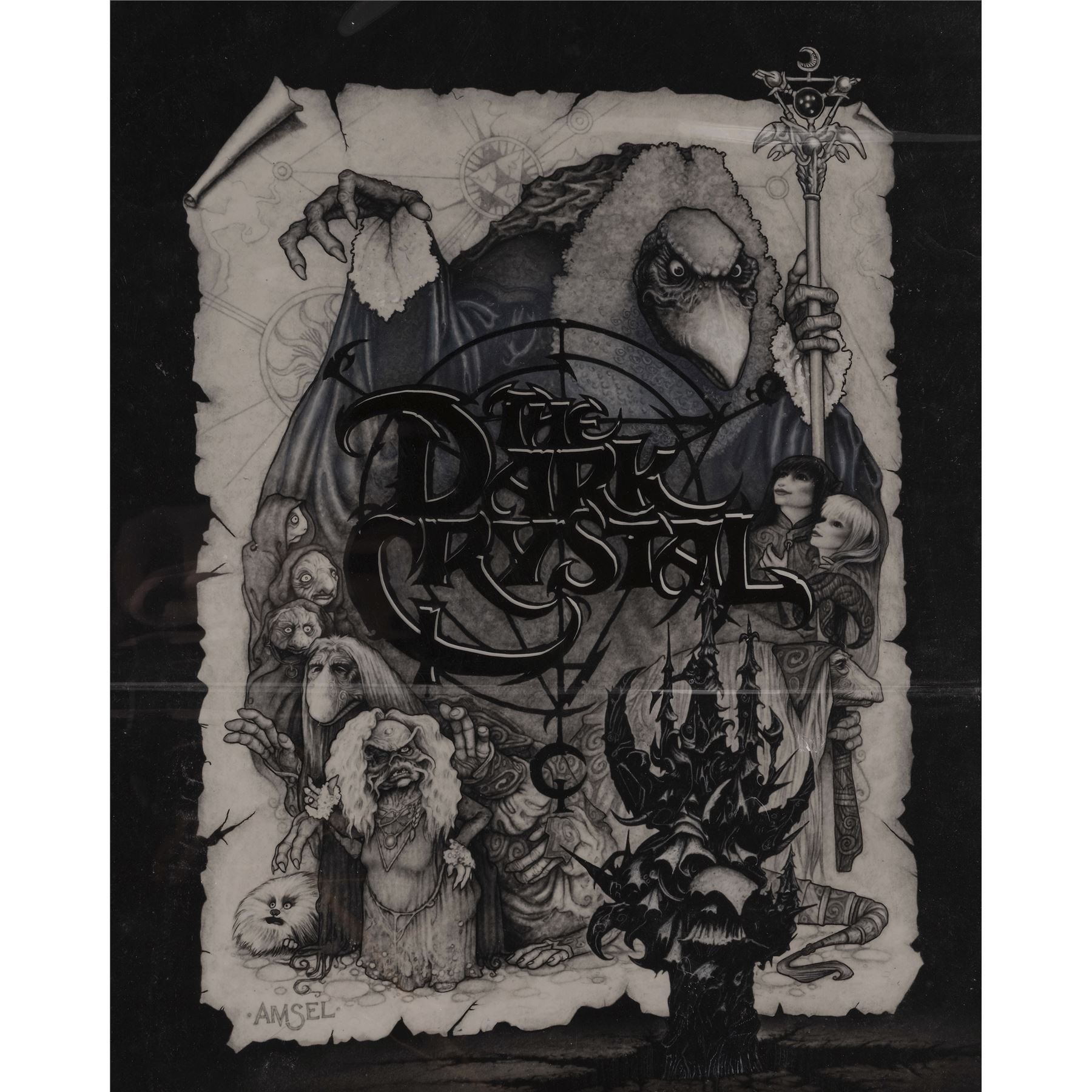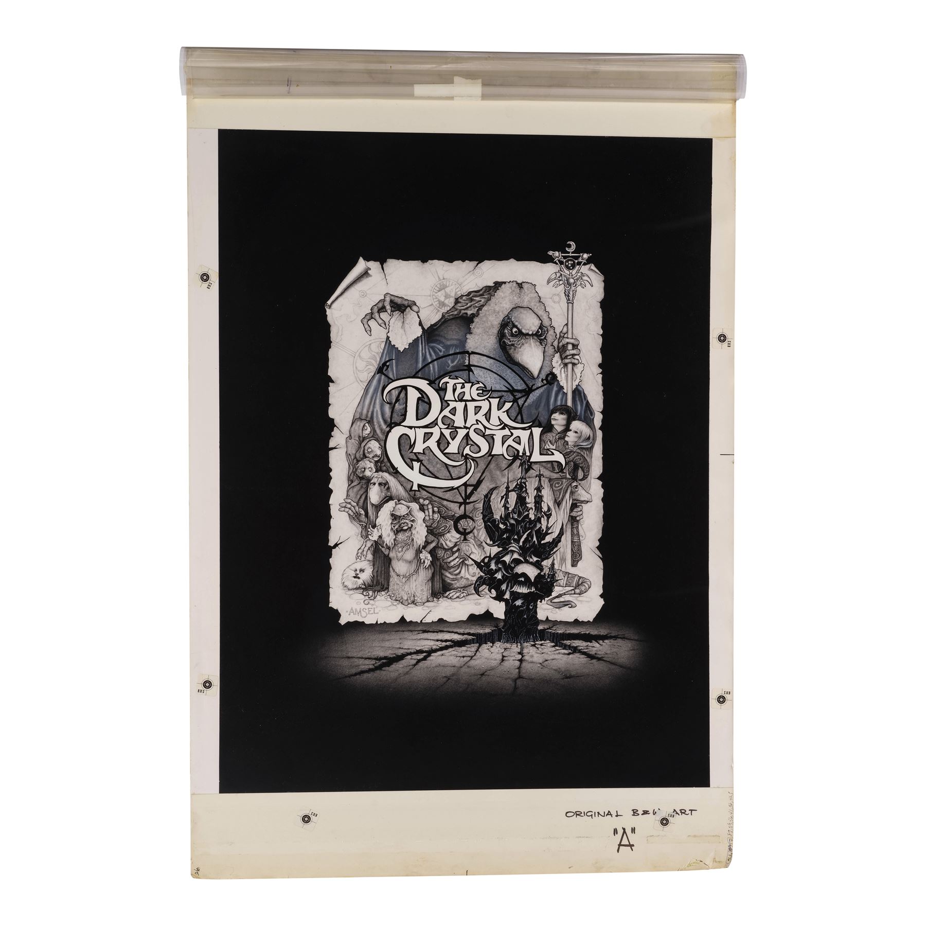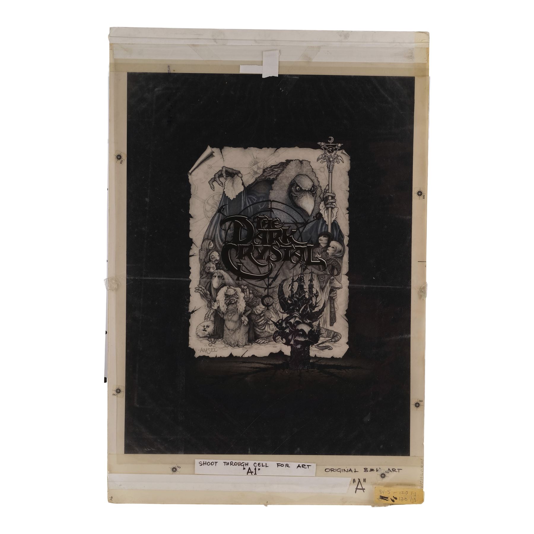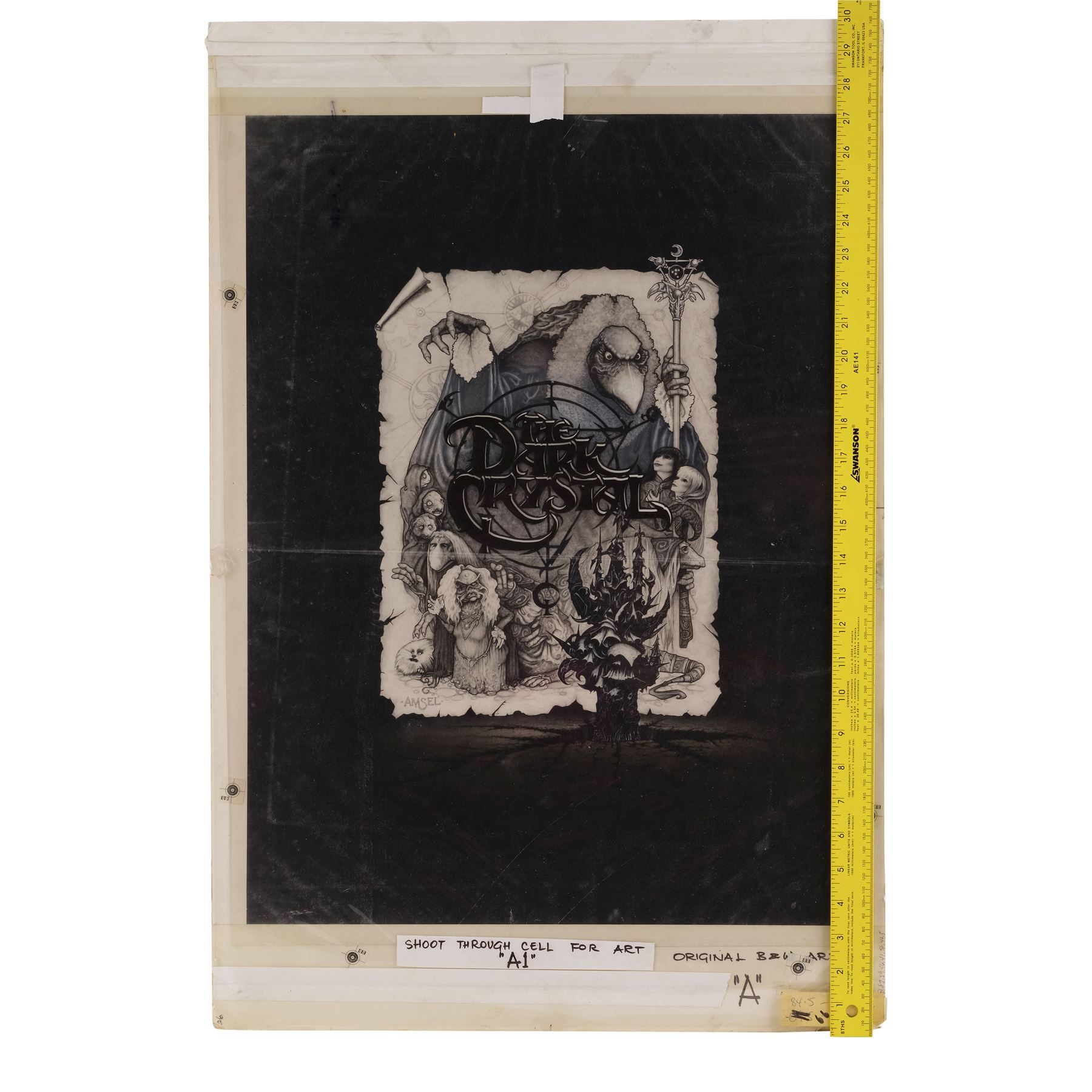 This lot consists of a black-and-white final ad slick of Amsel's poster design for The Dark Crystal with a painted black background to extend the space around it to fit the credits for the newspaper publication. It also features additional hand-illustrated linework and separate layers of shadows and the logo done on sheets of acetate. It comes affixed to an artboard with a protective sheet of acetate over it. It is hand-marked "Shoot Through Cell for Art 'A1''' and "Original BxW Art." The bottom is marked further when "'A'," a strip of tape hand-marked with "84.5-120 1.5.," and numbers written on the board itself. This lot exhibits some discoloration on the borders, as well as creasing on the corners. Dimensions: 20" x 30" (51 cm x 76.25 cm)