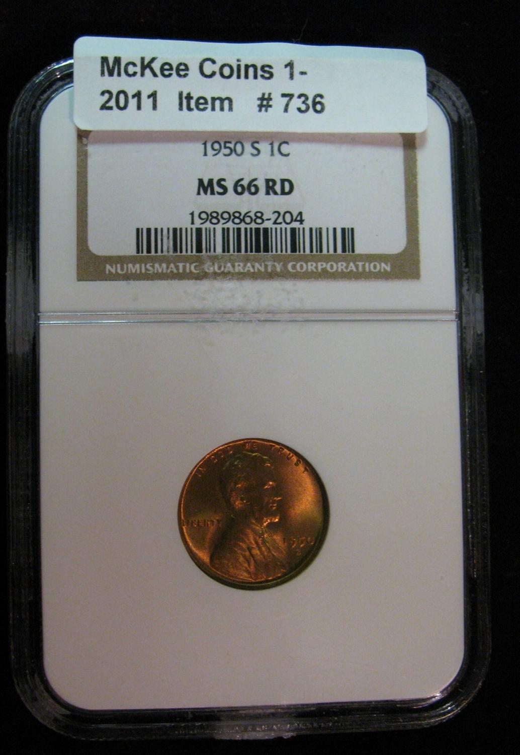 736. 1950 S Lincoln Cent. NGC slabbed MS 66 RD.