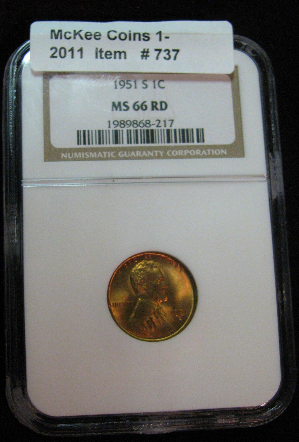 737. 1951 S Lincoln Cent. NGC slabbed MS 66 RD.