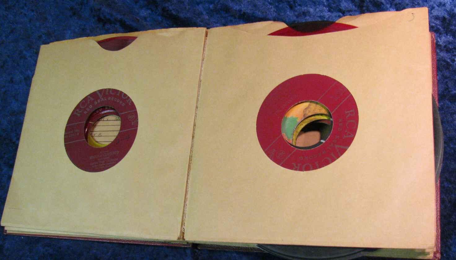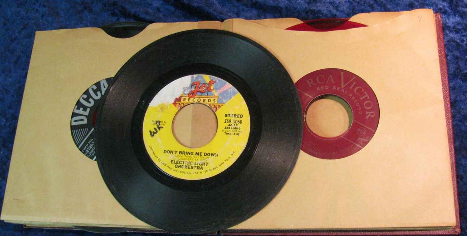 737. 45 RPM Record Album case with a large group of records including "You'll Never Find another Love Like Mine"; "Hungarian Rhapsody"; "Warsaw Concerto"; "The Donkey Serenade"; "This Was a Real nice Clambake"; "Bad Case of Loving You"; "I Love a Rainy Night"; "The Blue Danube"; "Oklahoma"; and much more. Some are scratched.