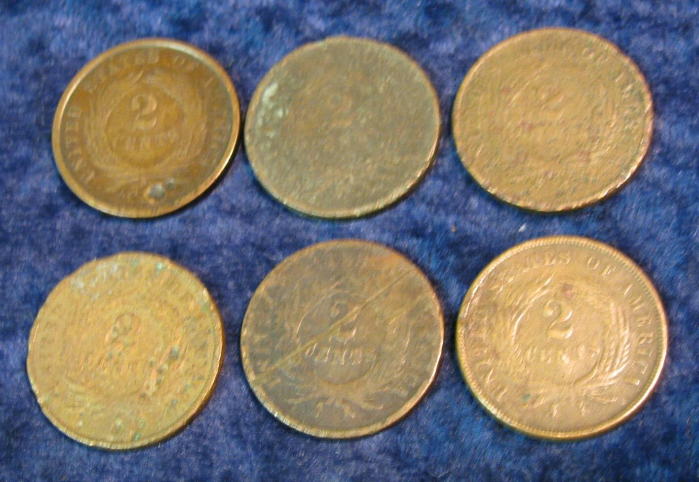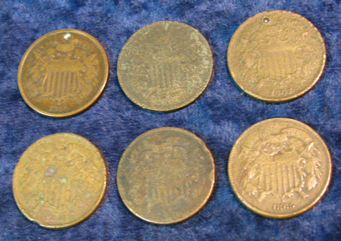 737. (6) Old Circulated U.S. Two Cent Pieces dating