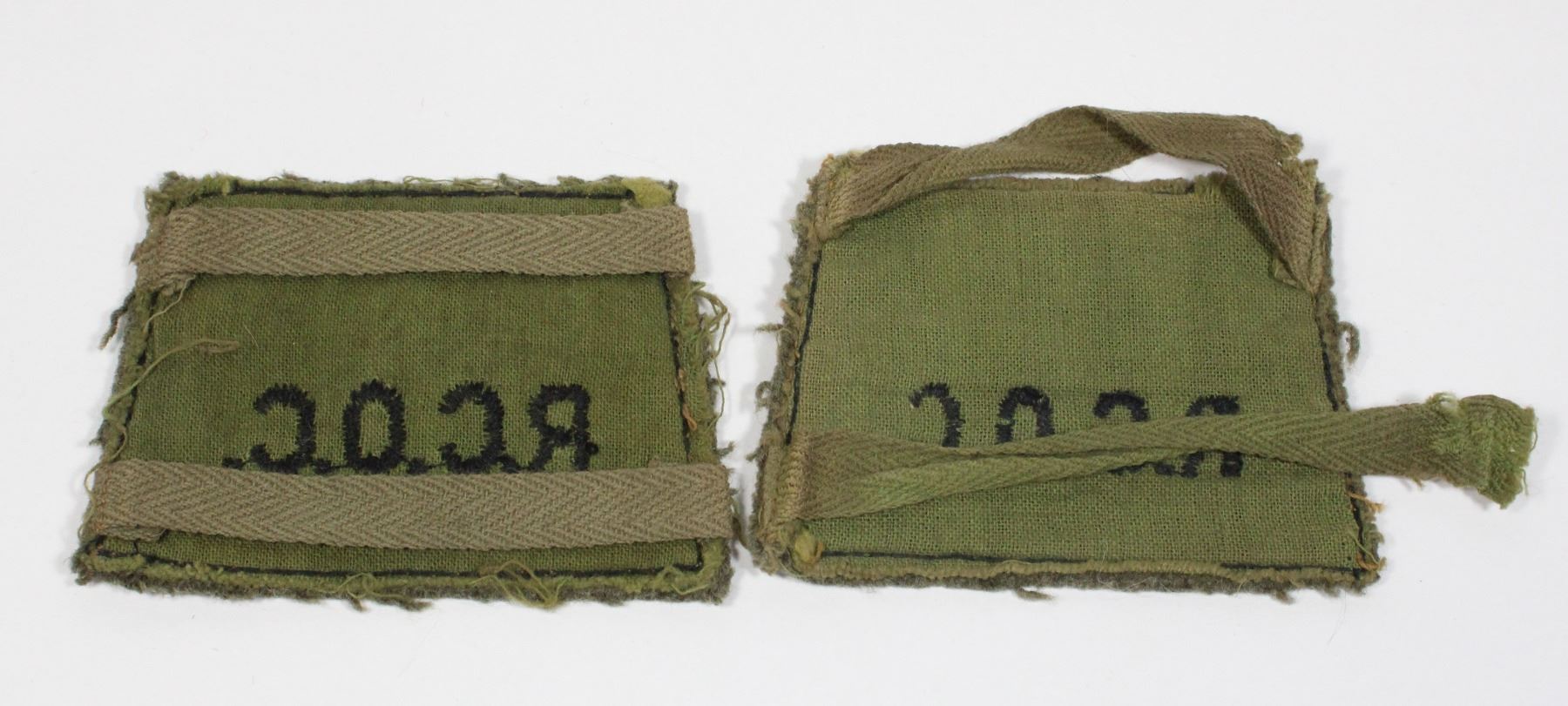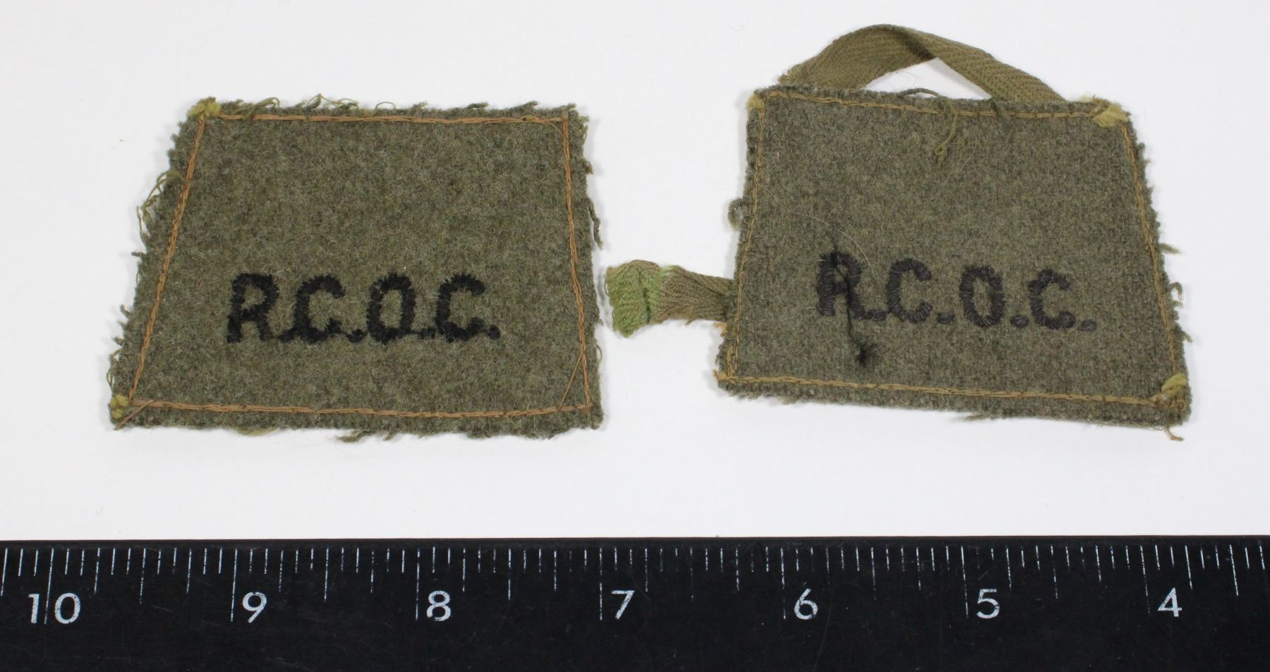 ROYAL CANADIAN ORDNANCE CORPS SLIP ON TITLE PAIR. WW2 RCOC WORLD WAR TWO CANADIAN CANADA ALLIED FORCES BATTLE DRESS INSIGNIA