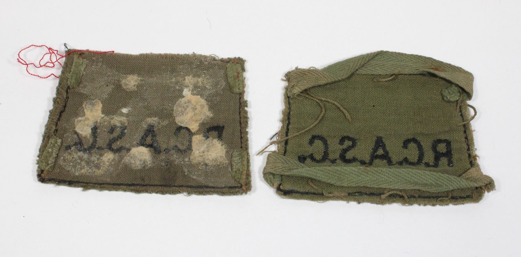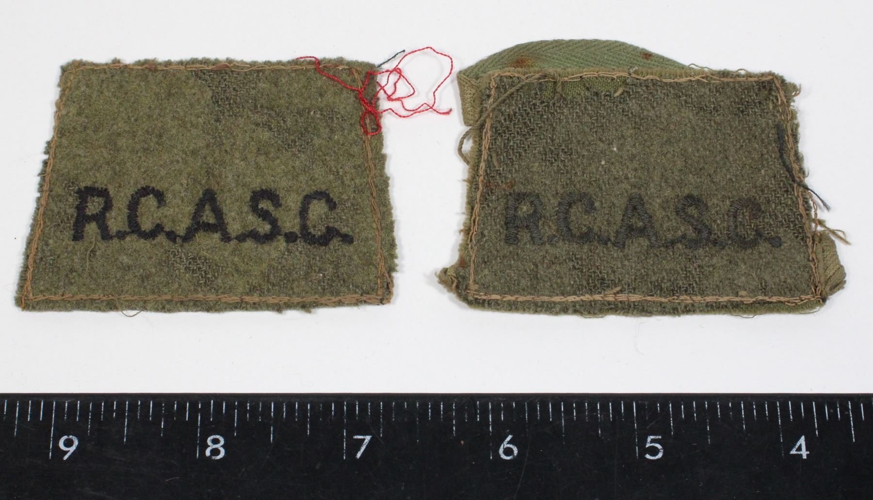 ROYAL CANADIAN ARMY SERVICE CORPS SLIP ON TITLE PAIR, ONE MISSING FASTENING BAND ON REVERSE. WW2 RCASC WORLD WAR TWO CANADIAN CANADA ALLIED FORCES BATTLE DRESS INSIGNIA