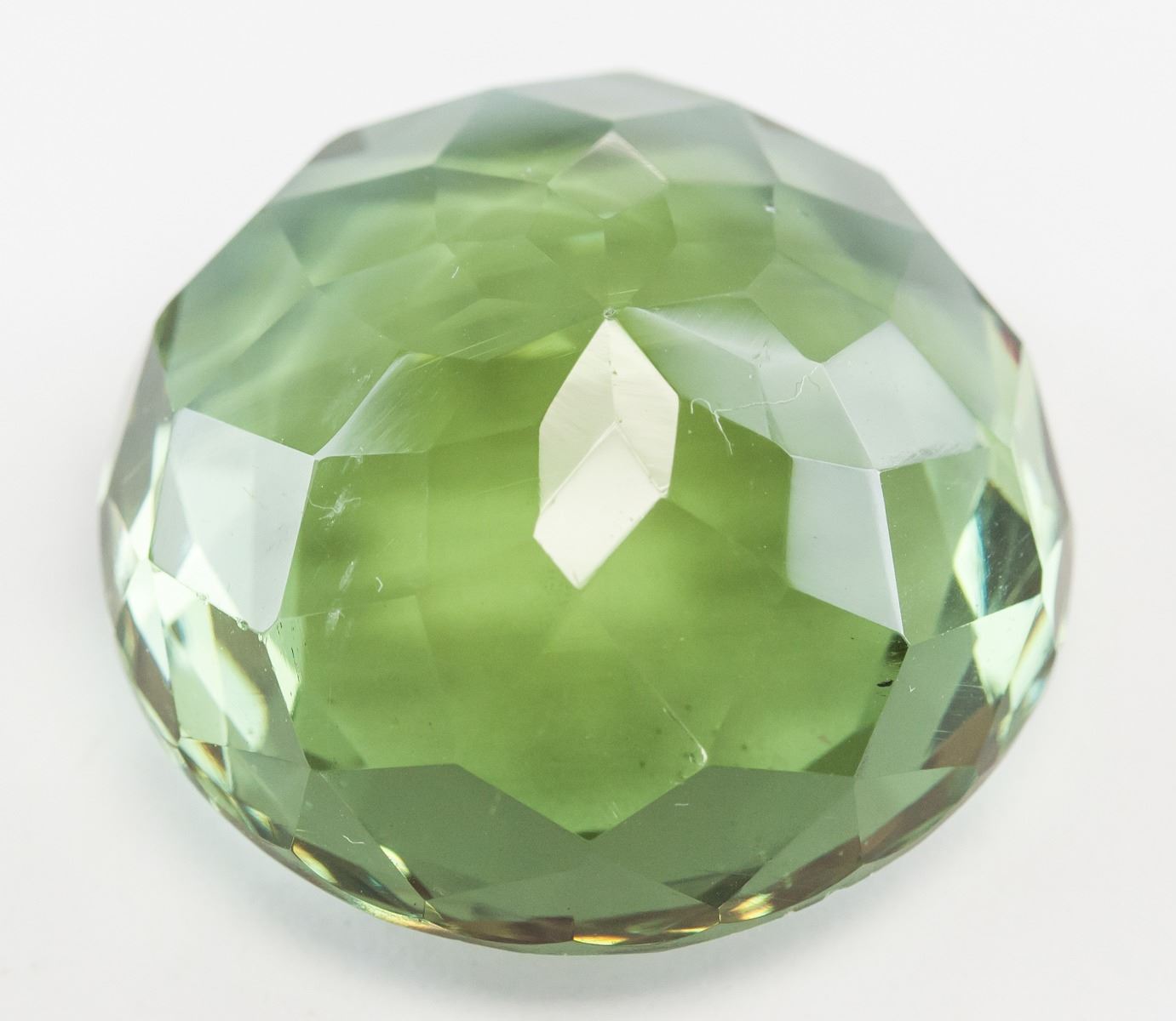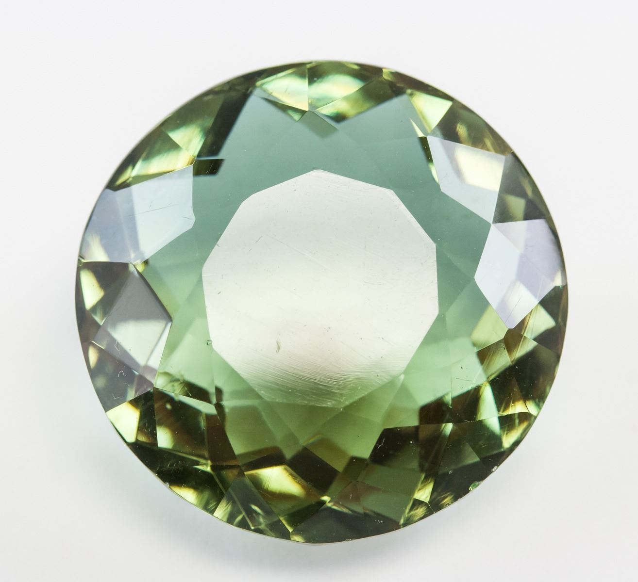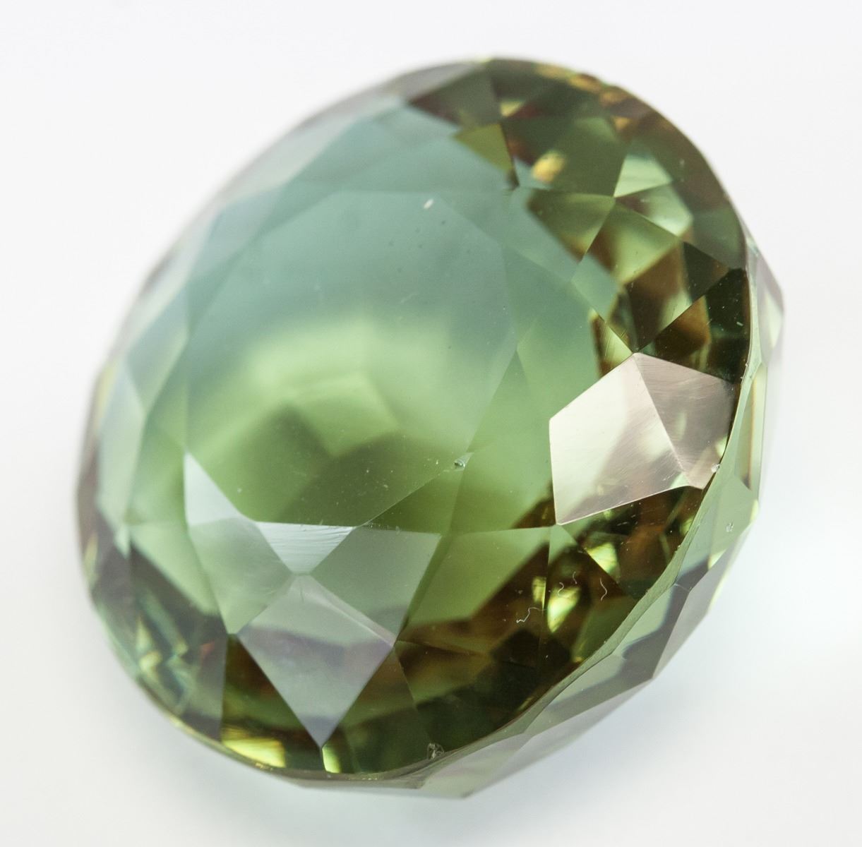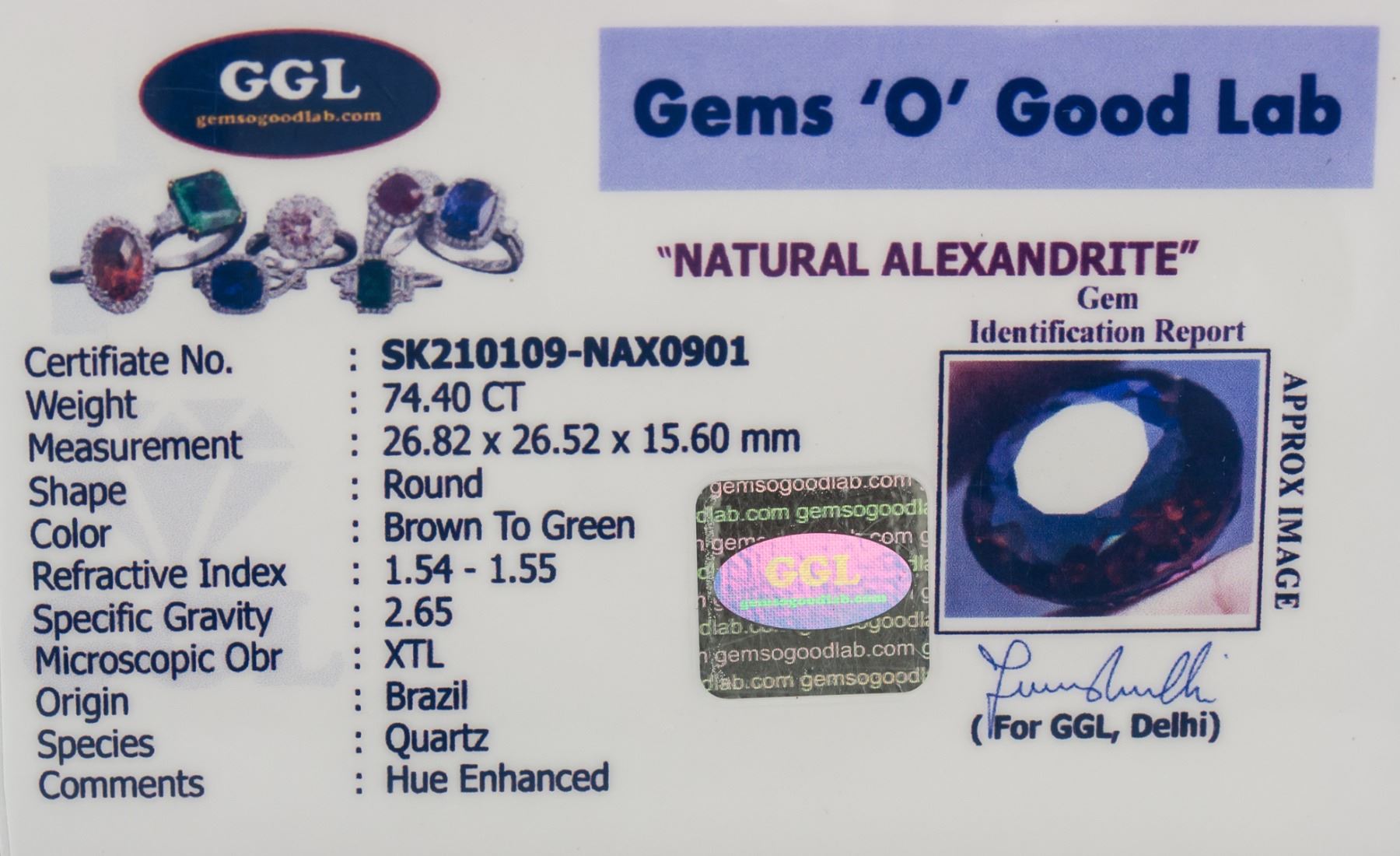 One (1) 74.40 ct round cut brown to green natural alexandrite. Origin: Brazil. Accompanied with GGL certificate. 26.82 x 26.53 x 15.60 mm.