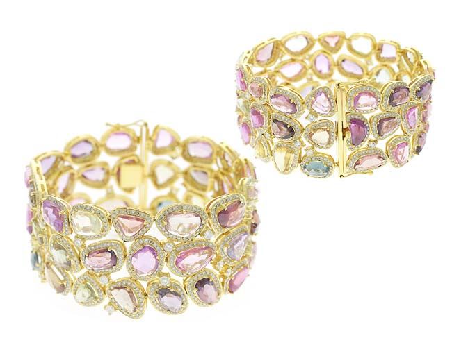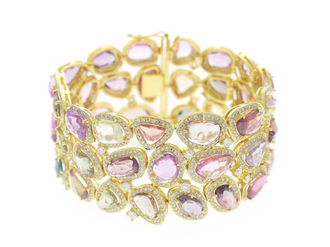 18k Gold MULTI COLOR SAPPHIRE AND DIAMOND BRACELET/Diamond Color & Clarity:G-H/SI1-SI3/Diamond Count 1:1127/Diamond 1 TCW:9.53/Diamond Color & Clarity 2:/Diamond Count 2:/Diamond 2 TCW:/Gemstone Count 1:47/Gemstone TCW 1:65.05/Gemstone Dimension:/Gemstone TCW 2:/Metal Type 1:18k Gold Yellow Gold //Weight Gram:54.01&Weight Gram:/Gross Weight:67.15