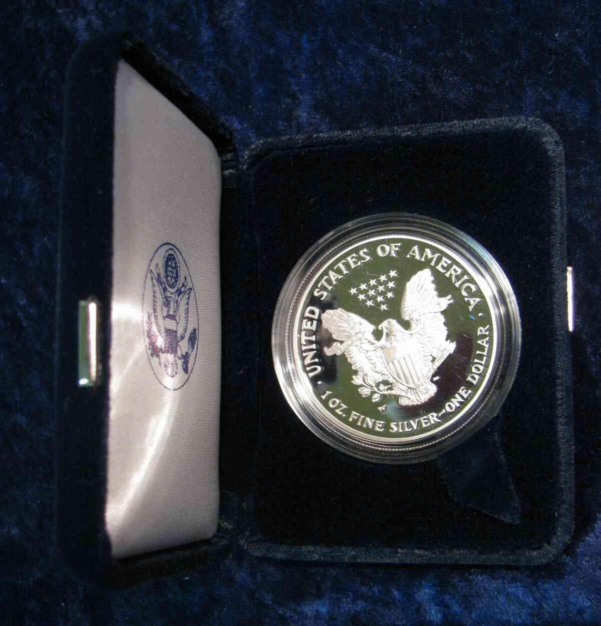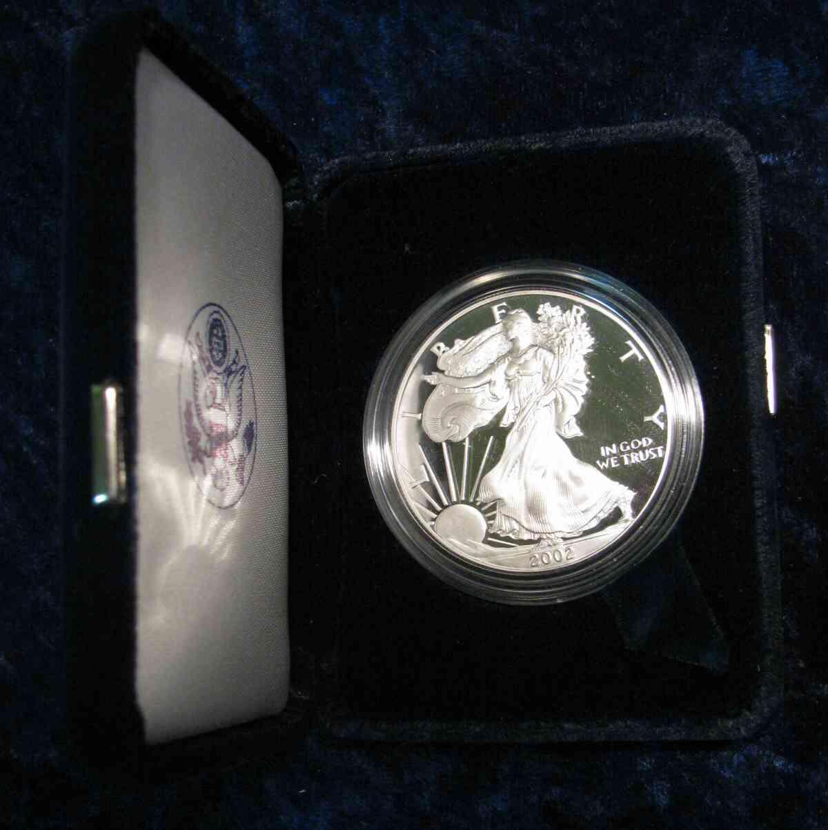 740. 2002 W Proof Silver American Eagle Dollar in original case as issued.
