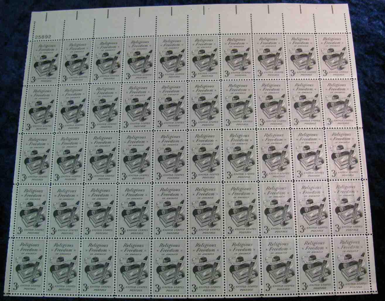 741. Original Mint Sheet of Religious Freedom in America .03c Stamps.