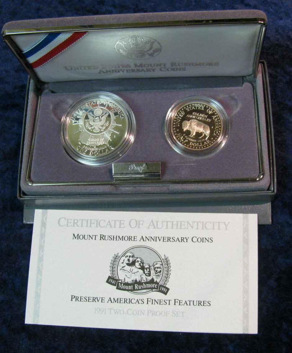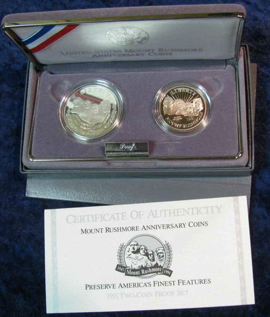 745. 1991 Two-Coin Proof Set of Mount Rushmore Anniversary Coins. Includes Silver Dollar and Half-Dollar. Original as issued with Certificate of Authenticity.