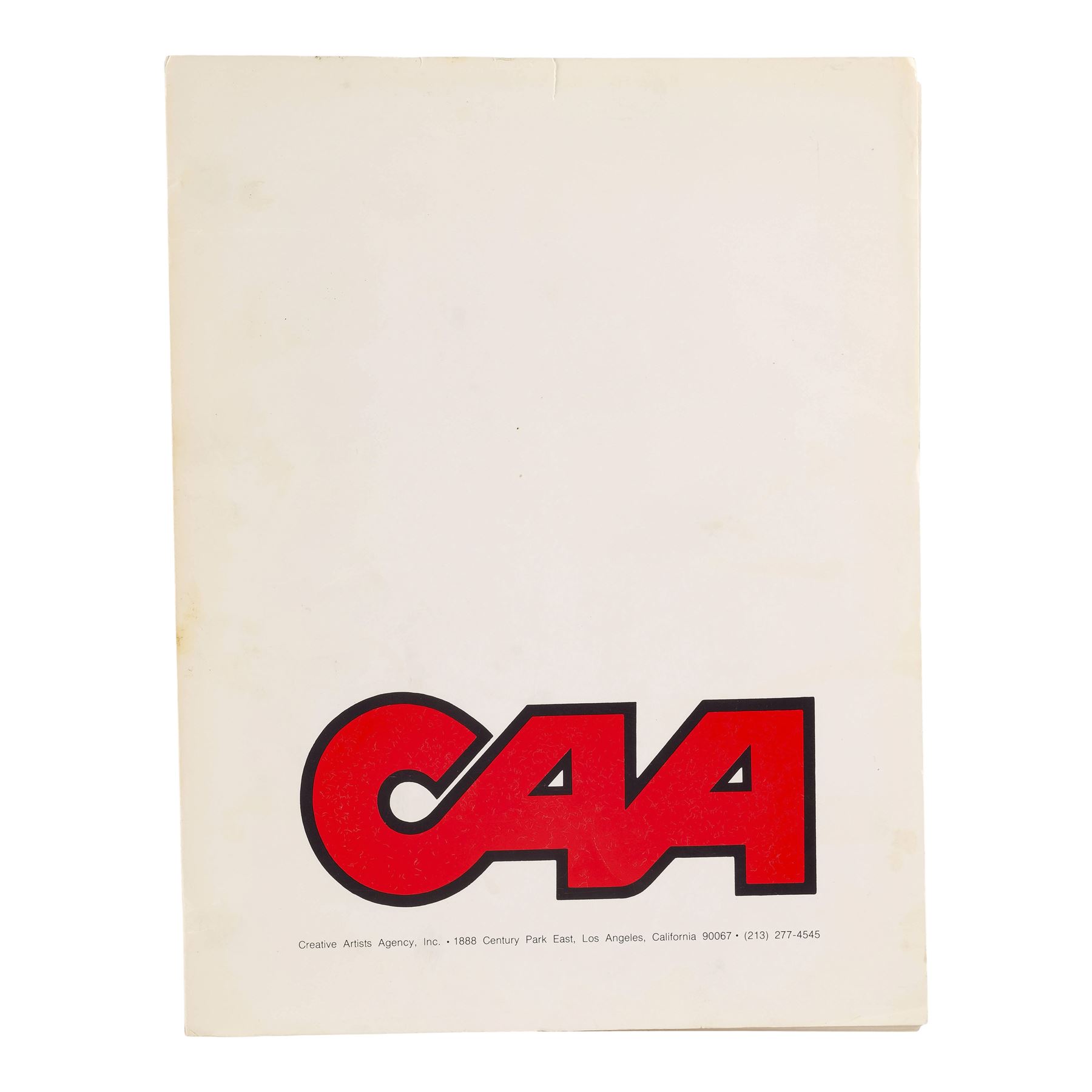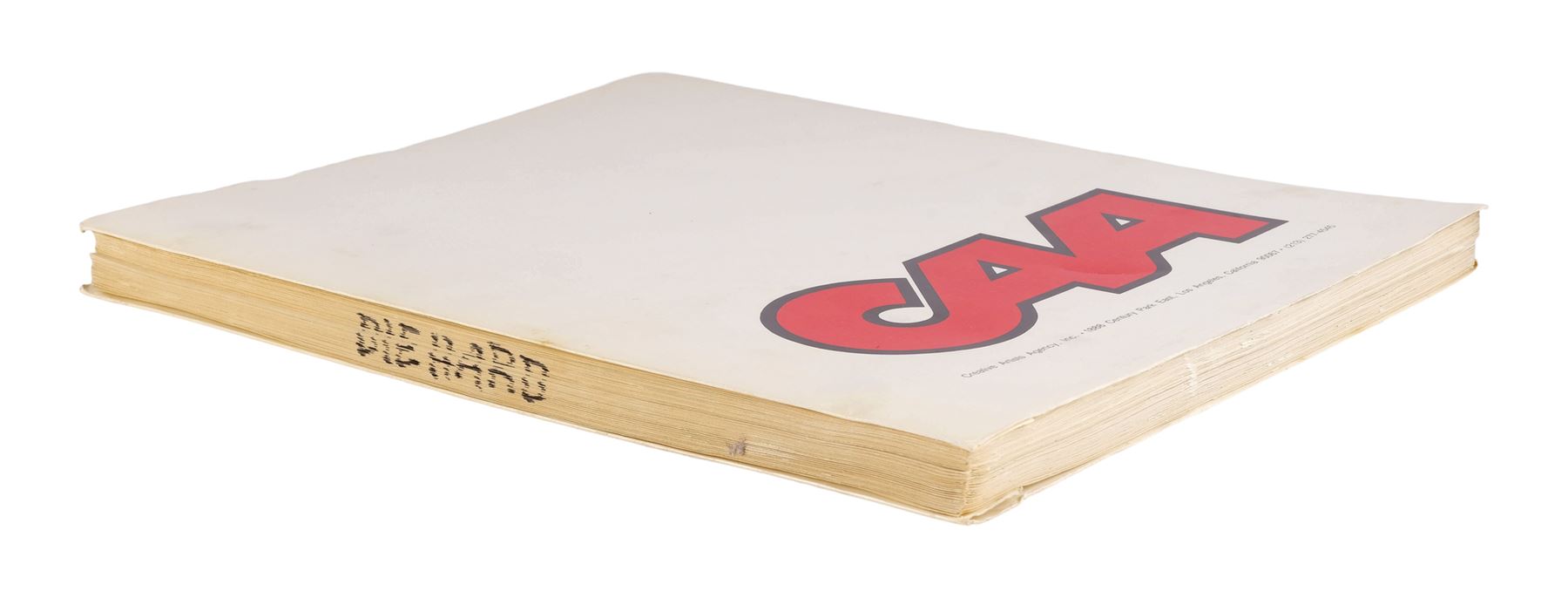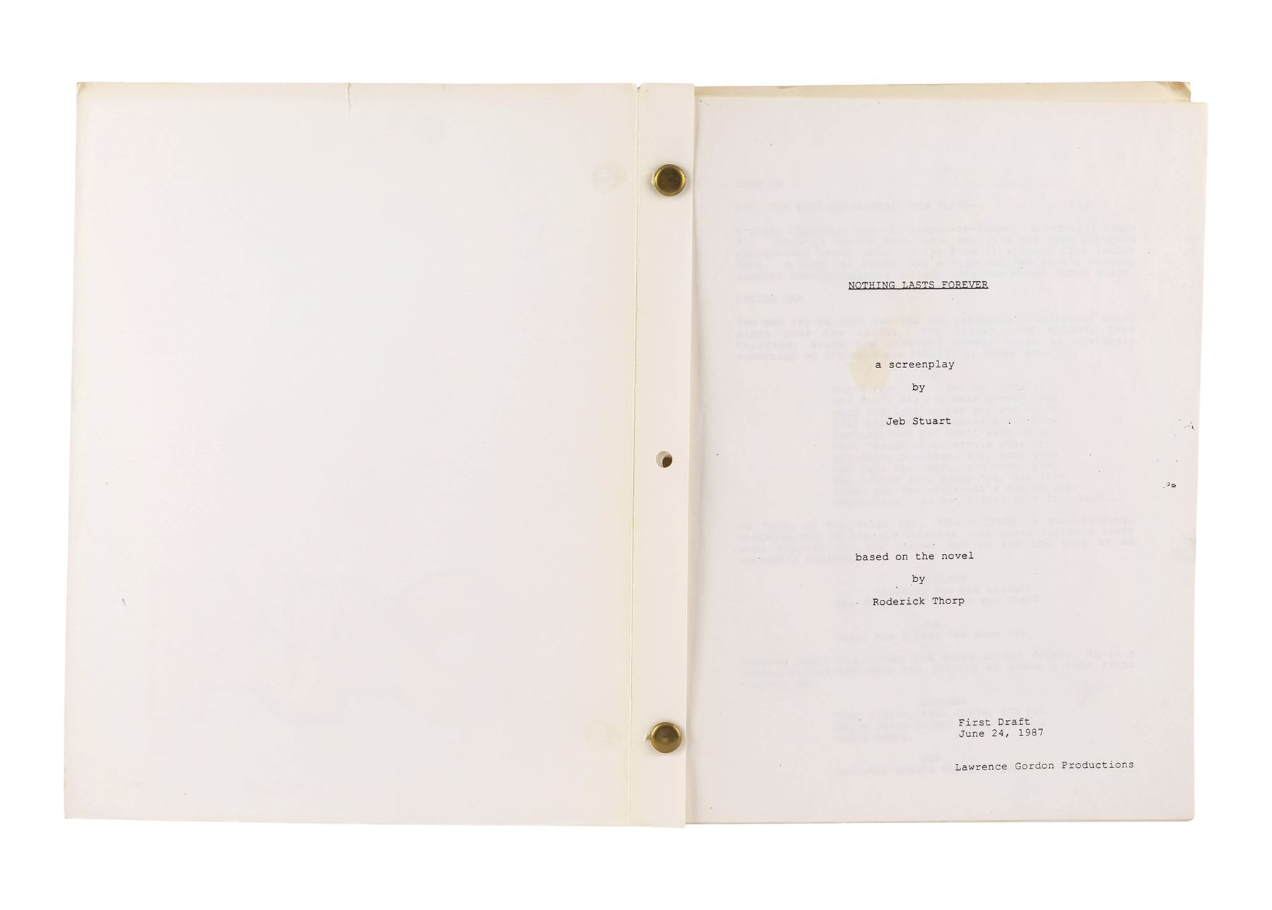 This lot consists of a first draft script dated June 24, 1987 titled "Nothing Lasts Forever" crediting Jeb Stuart based on Roderick Thorp's novel. This script consists of 125 pages bound in a cardstock cover branded Creative Artists Agency in red lettering and marked "DIE HARD" down the spine. This lot exhibits discolorations. Dimensions: 8.5l" x 11" x 1" (21.75 cm x 28 cm x 2.75 cm)