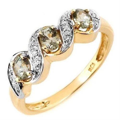 Size 6---This 10kt. yellow and white gold ring is prong set with three oval .72ctw. green sapphires and four round .02ctw. diamonds.