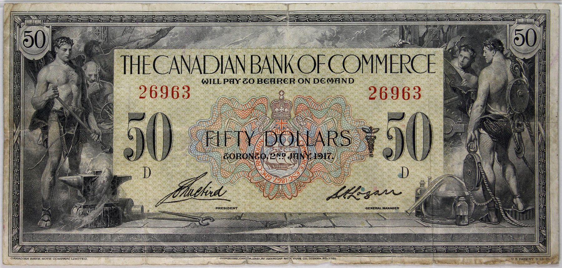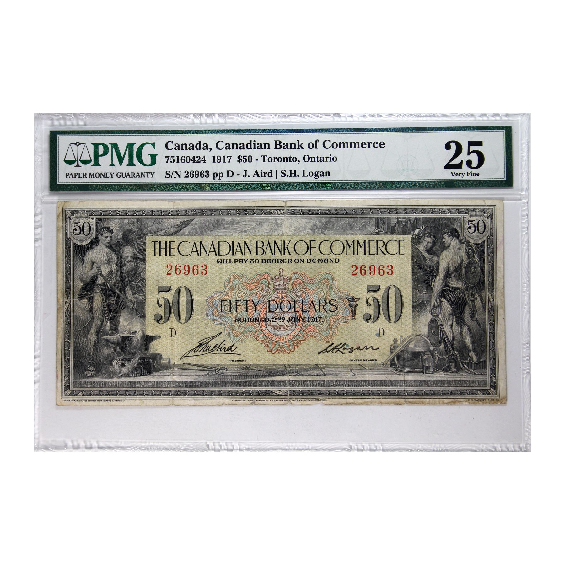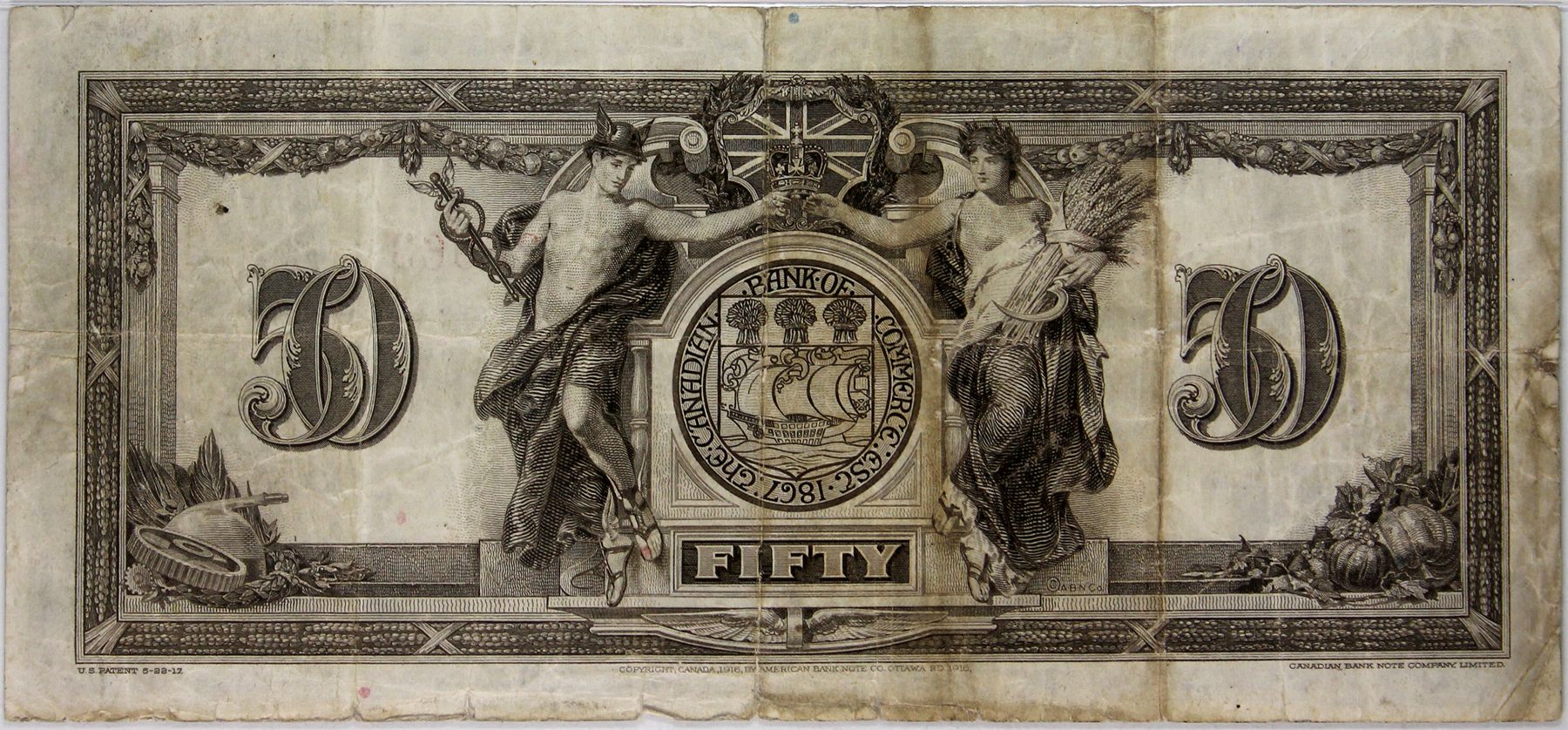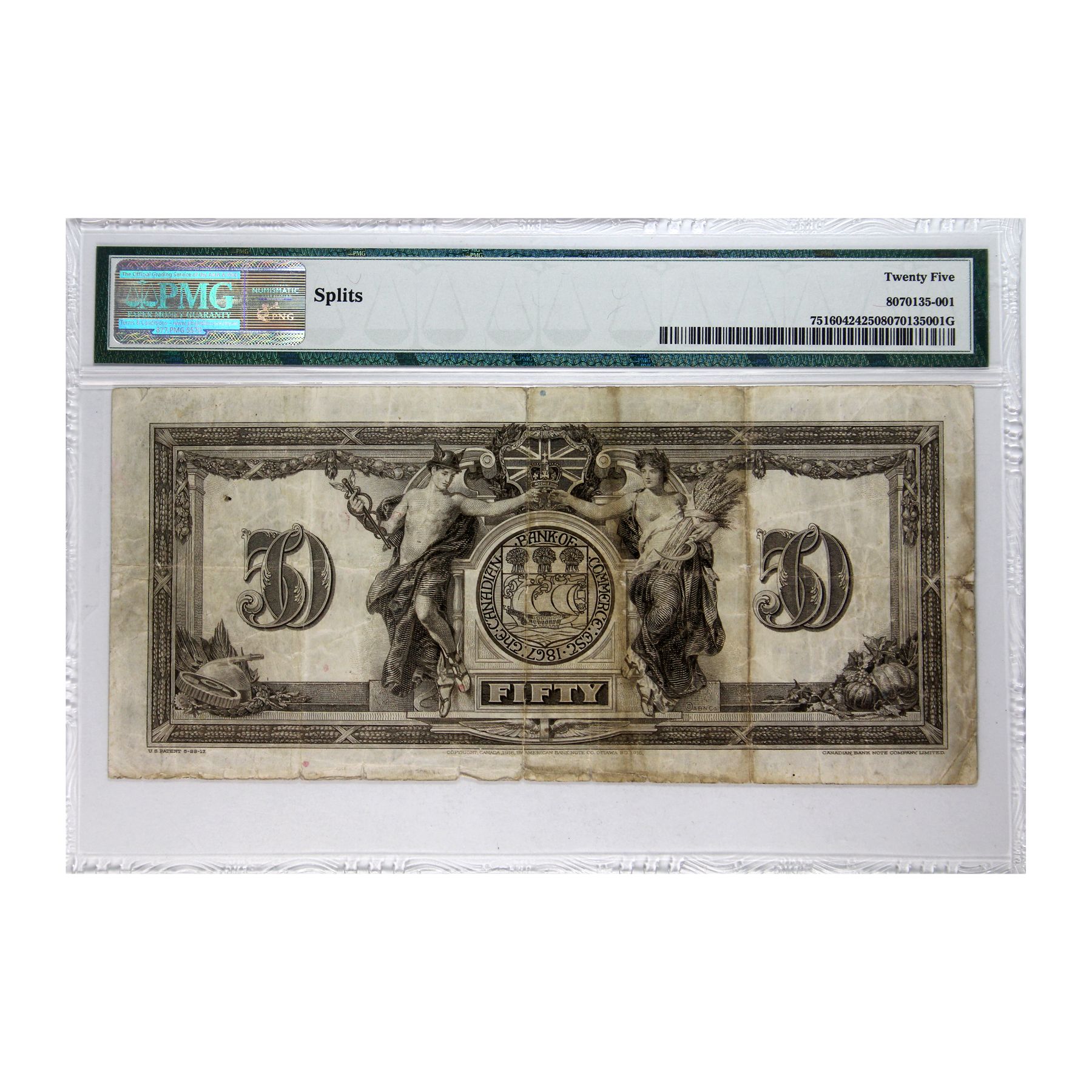 Tied for the highest grade among the 25 examples of its kind: it’s rare to encounter this signature in so high a grade. On the left of the design, Vulcan (or Hephaestus) stands over a smoking forge, while on the right a laurel-wreathed young man shoulders a corded pulley system, symbolizing the waxing industry of the Dominion – not to mention the Classical design taste of her bankers.