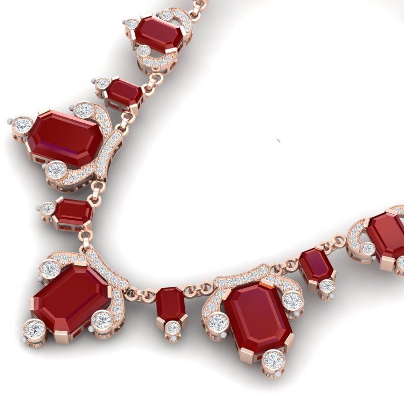 75.21 CTW Royalty Ruby & VS Diamond Necklace 18K Rose Gold ---- Luxury Designer Brand Necklace Appraised Retail Price at $120,000 ---- SKU Number US38749 18K Rose gold Necklace Size is 16 Inches, Can custom fit length, Necklace measuring approx. 3 x1 Inches, weighing in total approx. 45 grams. Made in the USA and is stamped 18K, Main stone 41.11 carat total weight containing 3 pieces of Intense Mid-Opaque Red color with AAA quality Emerald Cut shape cut Ruby , Stone #2 26.62 carat total weight containing 8 pieces of Intense Mid-Opaque Red color with AAA quality Emerald Cut shape cut