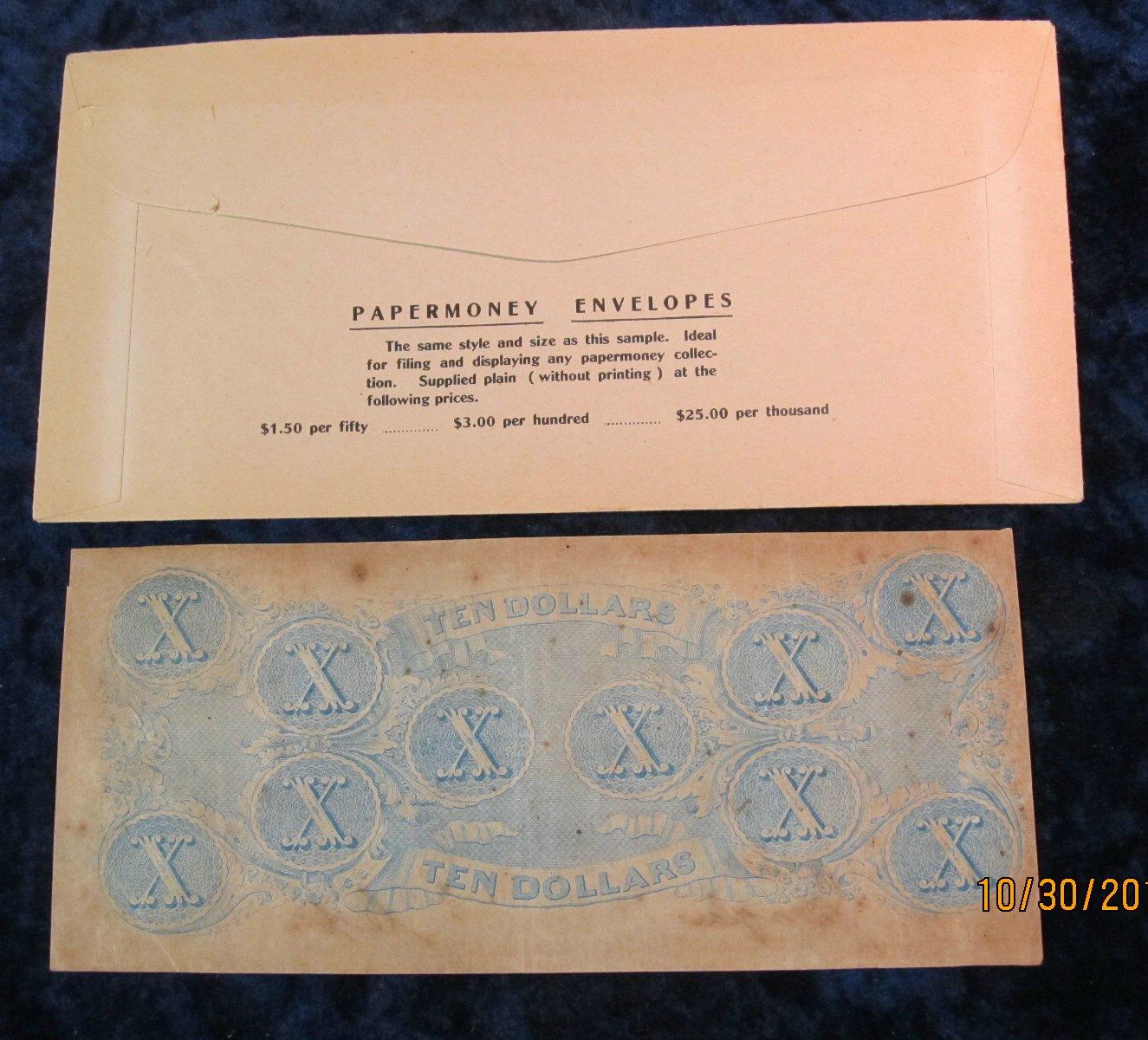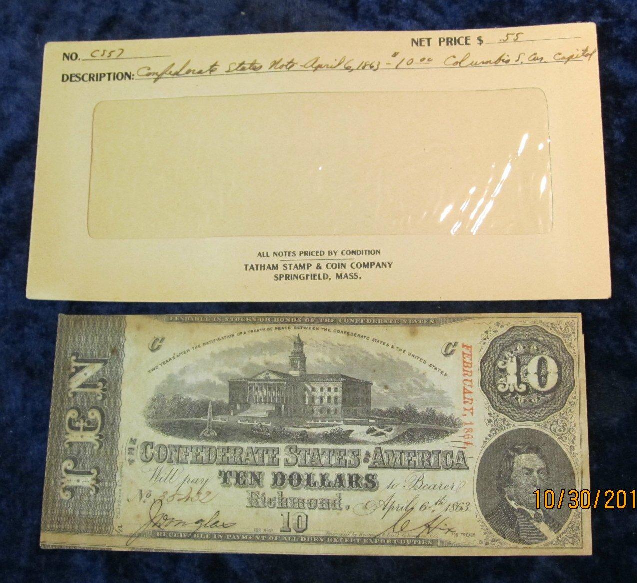 75. CS 57 $10 "The Confederate States of America" Banknote. EF. Still in original envelope with handwritten description where it was catalogued as CS57 and priced by Tatham Stamp & Coin Co. to sell for .55c about sixty years ago.