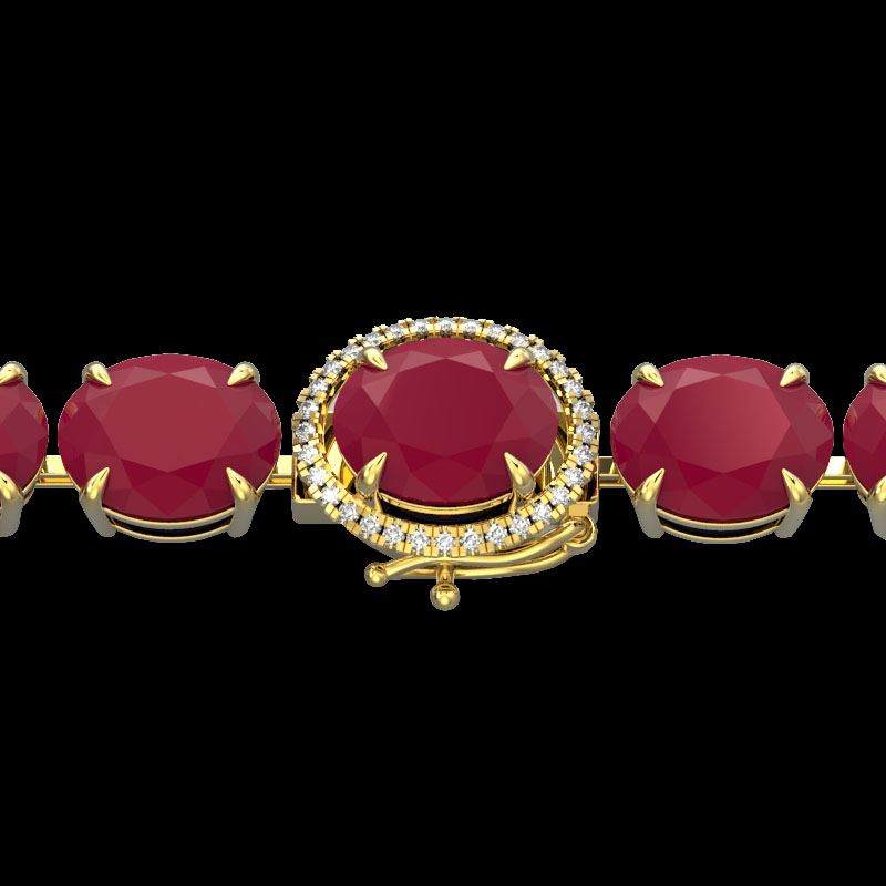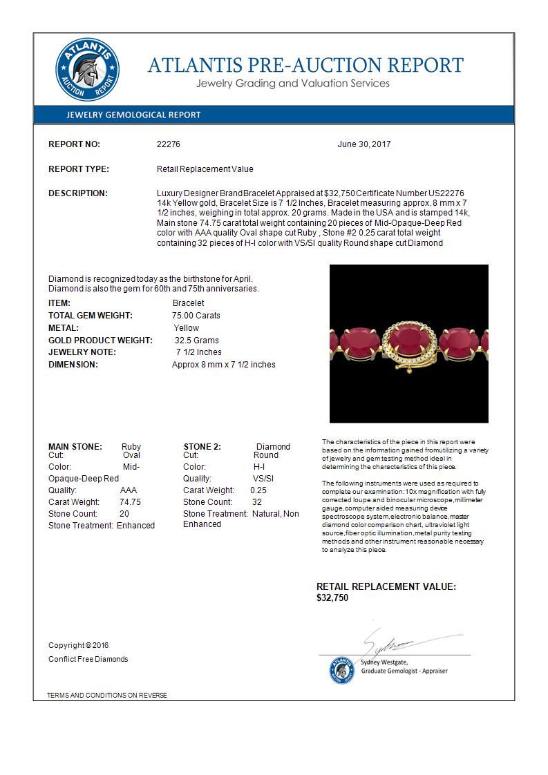 75 CTW Ruby & Micro Pave VS/SI Diamond Halo Designer Bracelet 14K Yellow Gold ---- Luxury Designer Brand Bracelet Appraised Retail Price at $32,750 ---- SKU Number US22276 14k Yellow gold Bracelet Size is 7 1/2 Inches, Bracelet measuring approx. 8 mm x 7 1/2 inches, weighing in total approx. 20 grams. Made in the USA and is stamped 14k, Main stone 74.75 carat total weight containing 20 pieces of Mid-Opaque-Deep Red color with AAA quality Oval shape cut Ruby , Stone #2 0.25 carat total weight containing 32 pieces of H-I color with VS/SI quality Round shape cut