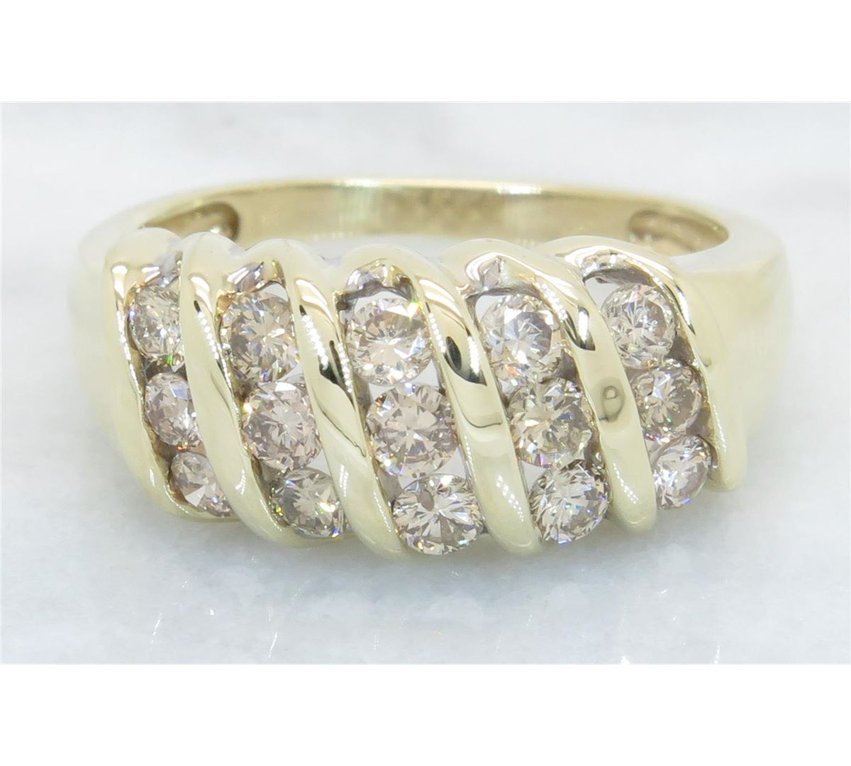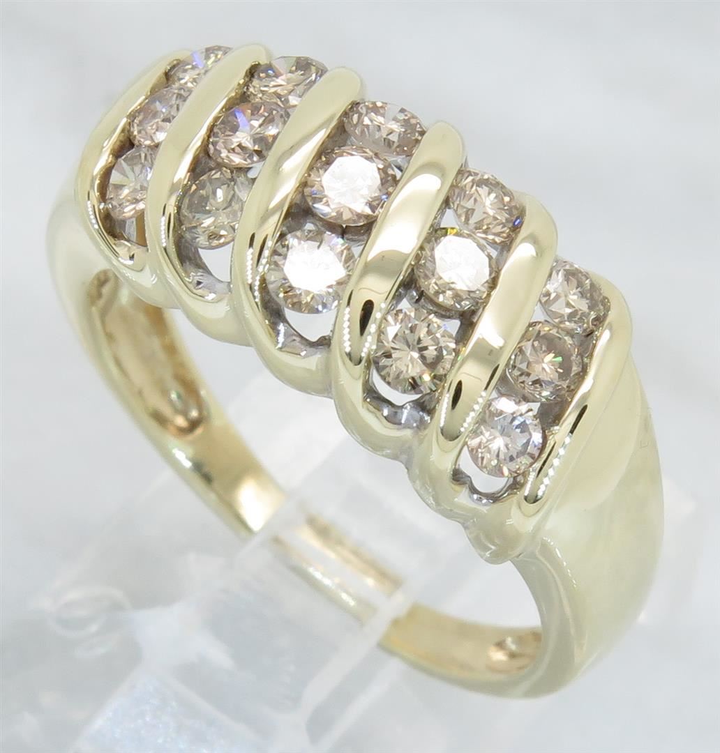 One tested 10K yellow gold diamond ring. Containing: 15 Round Brilliant Cut Diamonds. Clarity: SI, Color: light chocolate. Approximate total diamond weight: .75CTW. All diamonds are graded in the mounting unless otherwise stated. Weight of ring: 3.9 grams, Size: 7.0.