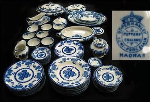 75 pieces of Flow Blue Flo Blue in the pattern "Madras" Round back stamp with Crown by "Upper Hanley Pottery England Semi Porcelain" Some crazing, some chips - a broken lid. 12 Dinners, 12 Rim Soups, 11 Saucers, 11 small bowls, 11 smaller bowls etc.
