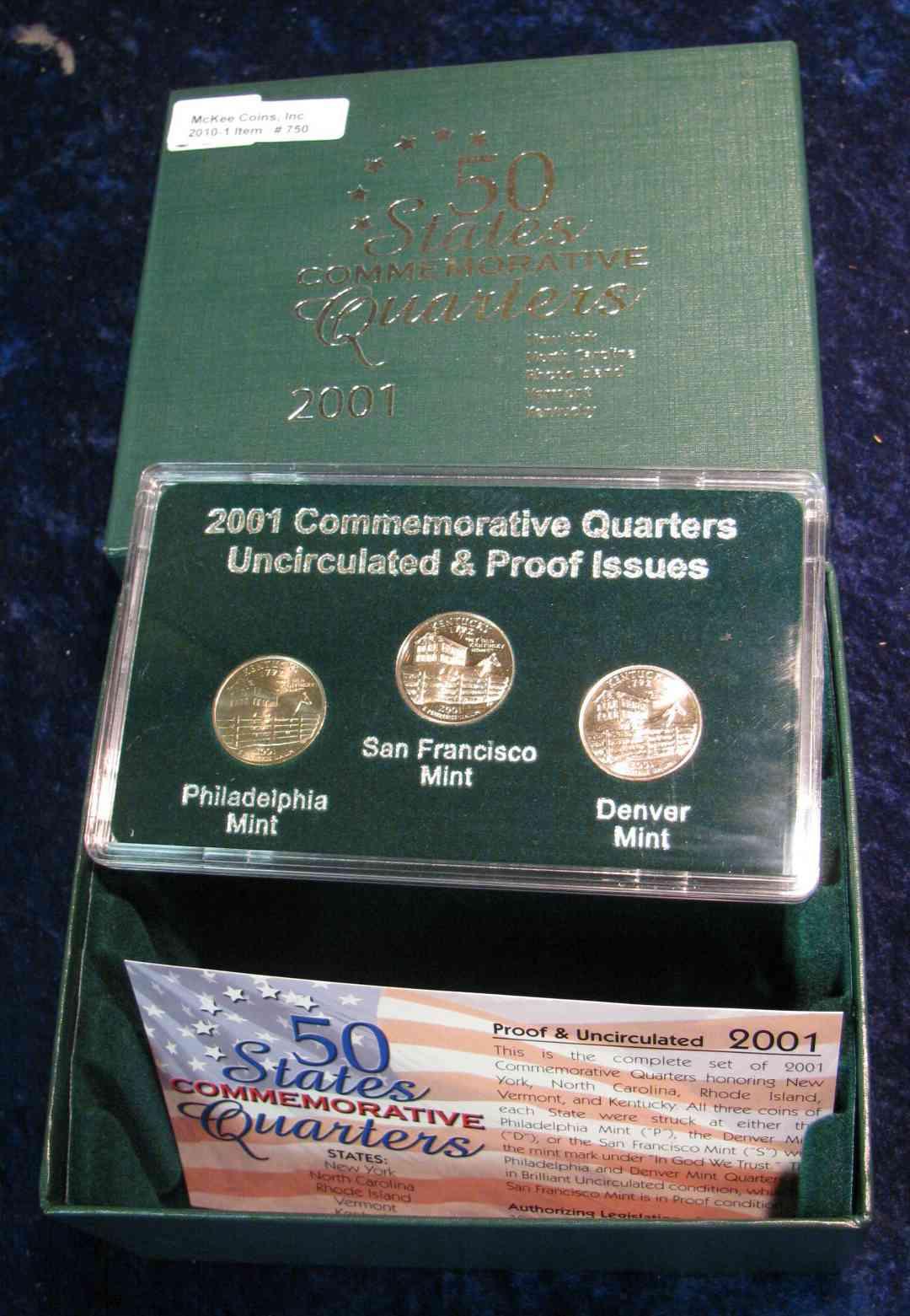 750. 2001 P, D, S BU & Proof Kentucky Statehood Quarter Set. Encased. Includes box for complete five holder 2001 set.
