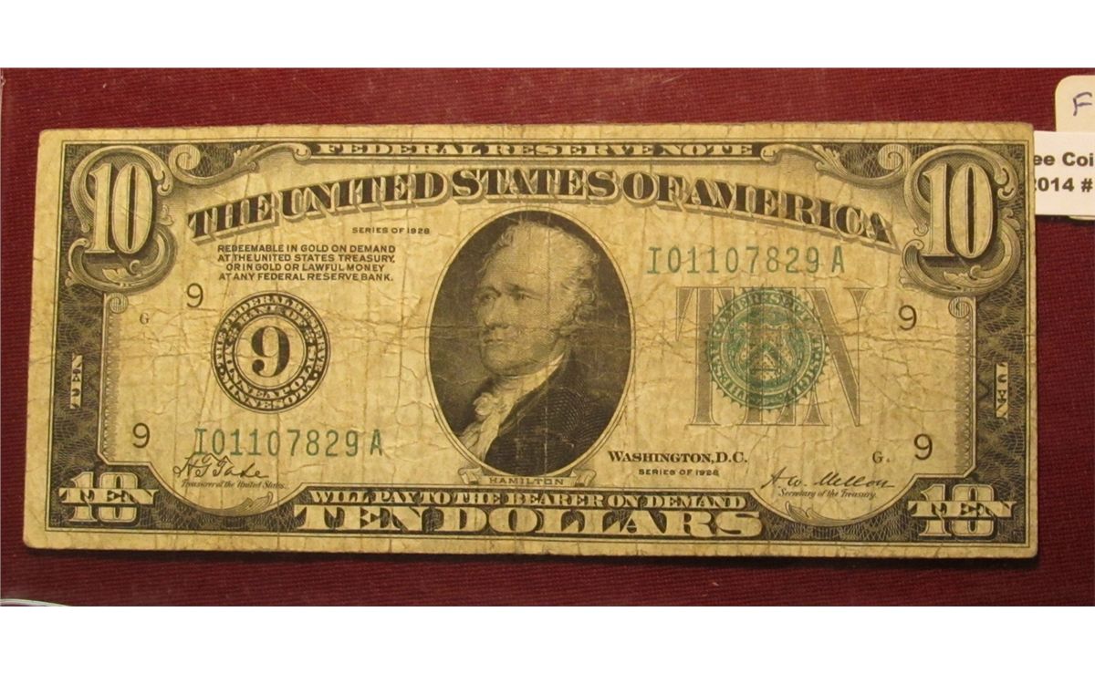 750. Series 1928 $10 Federal Reserve Note. Minneapolis, Minnesota. "Redeemable in Gold on Demand at the United States Treasury, or In Gold or Lawful Money at Any Federal Reserve Bank". Signed Tate and A.W.Mellon. G.