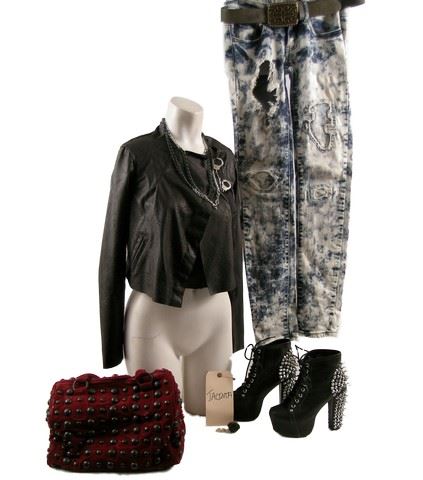 Jacinta Bloch (Scout Taylor-Compton) screen worn, hero, black faux leather with clips on the front and small handcuffs 'Bar III' jacket, (size XS) grey ribbed cut at the bottom 'American Apparel' tank top, (size S) chain necklace, two rings, painted red with studs purse, brown leather with large buckle belt, bleached blue with holes on the front denim pants, and black leather with spikes on the back platform 'Havana Last' shoes. (size 7) Includes wardrobe tag!