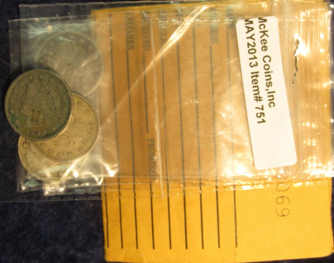 751. 1900 Liberty Nickel Counterstamped "H"; 1907 VF+, 1883 WC G-4, & 1912 VF Liberty Nickels.