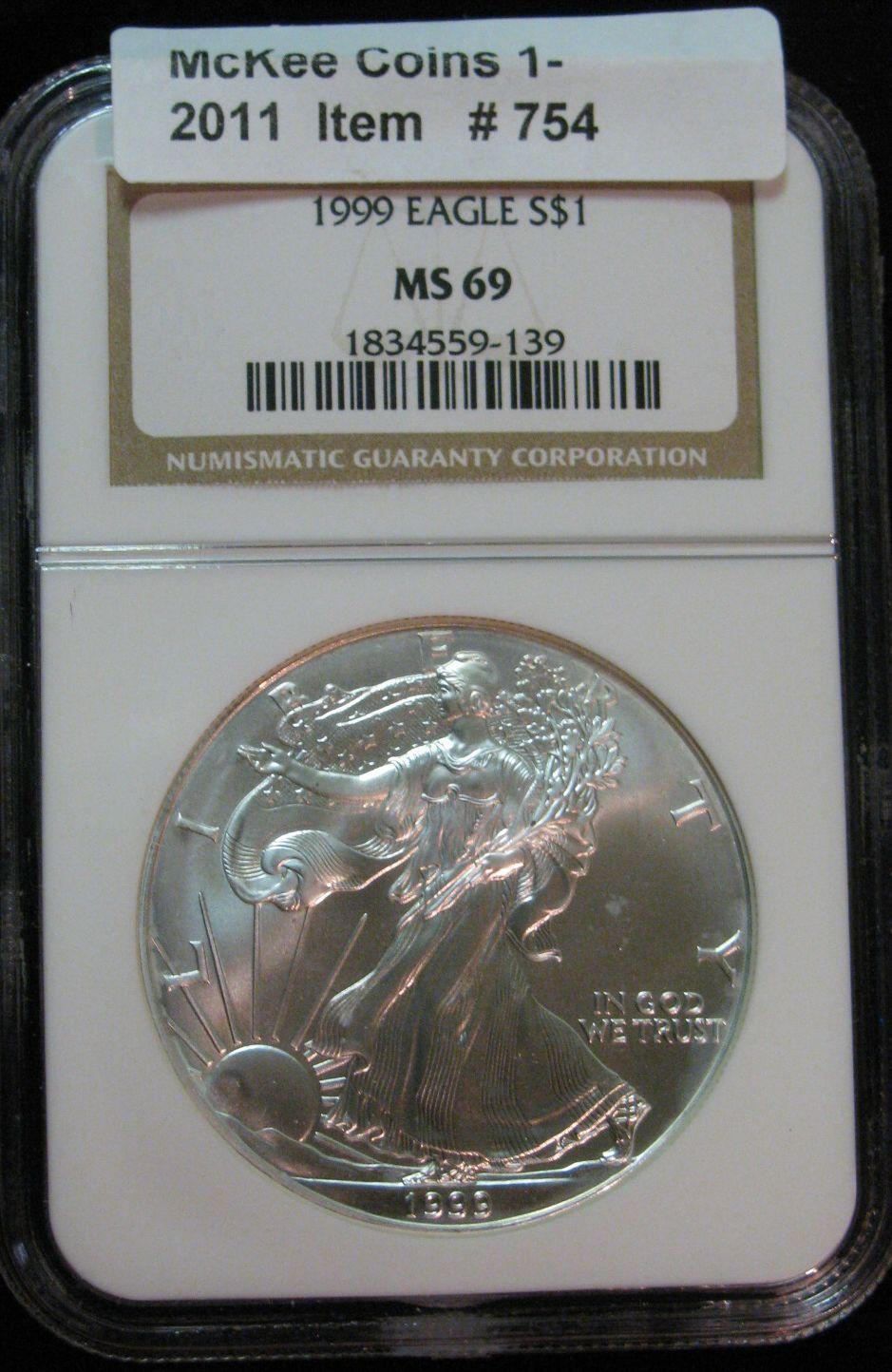 754. 1999 U.S. Silver Eagle Dollar NGC slabbed MS 69.