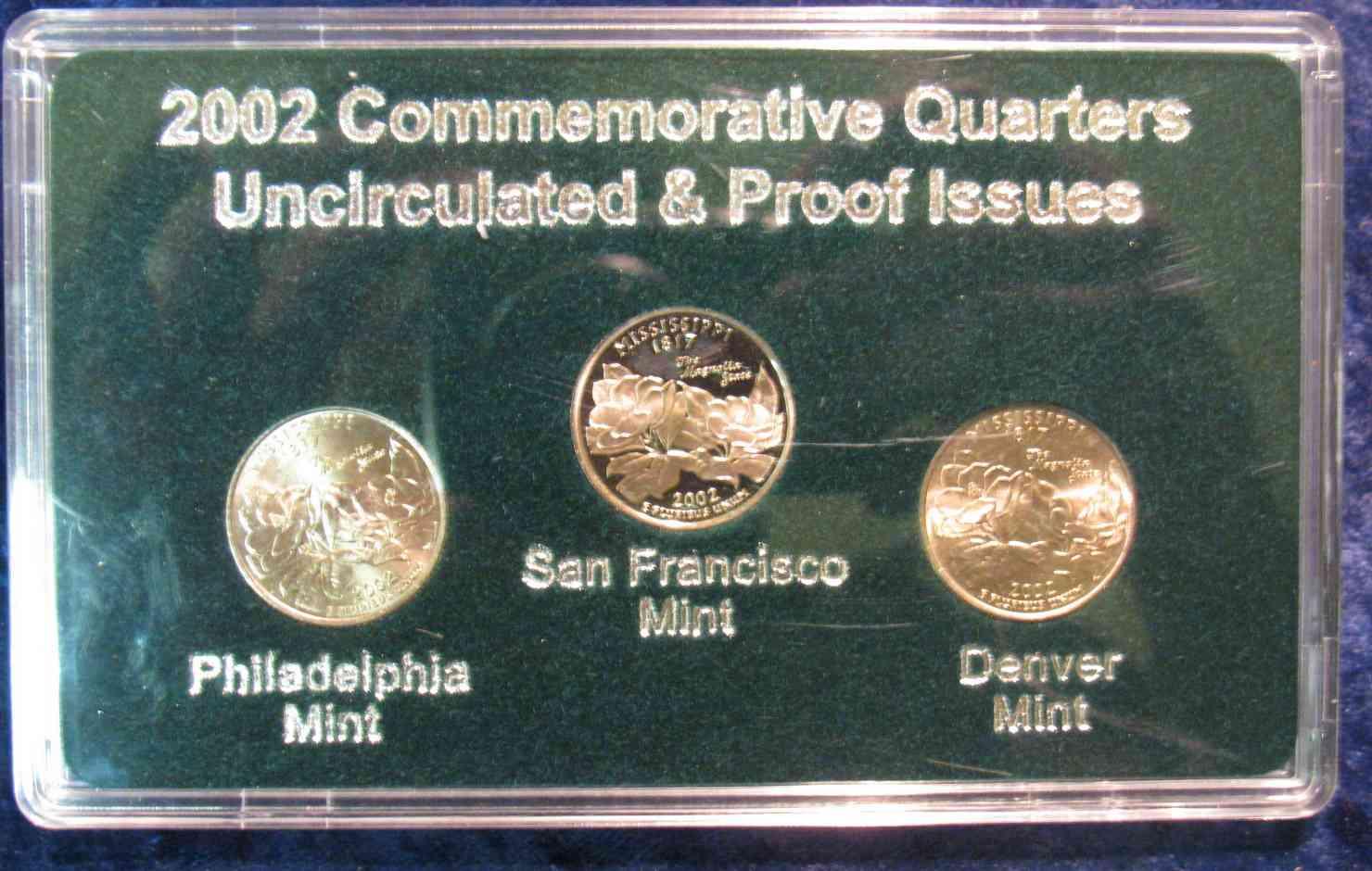 754. 2002 P, D, S BU & Proof Mississippi Statehood Quarter Set. Encased.