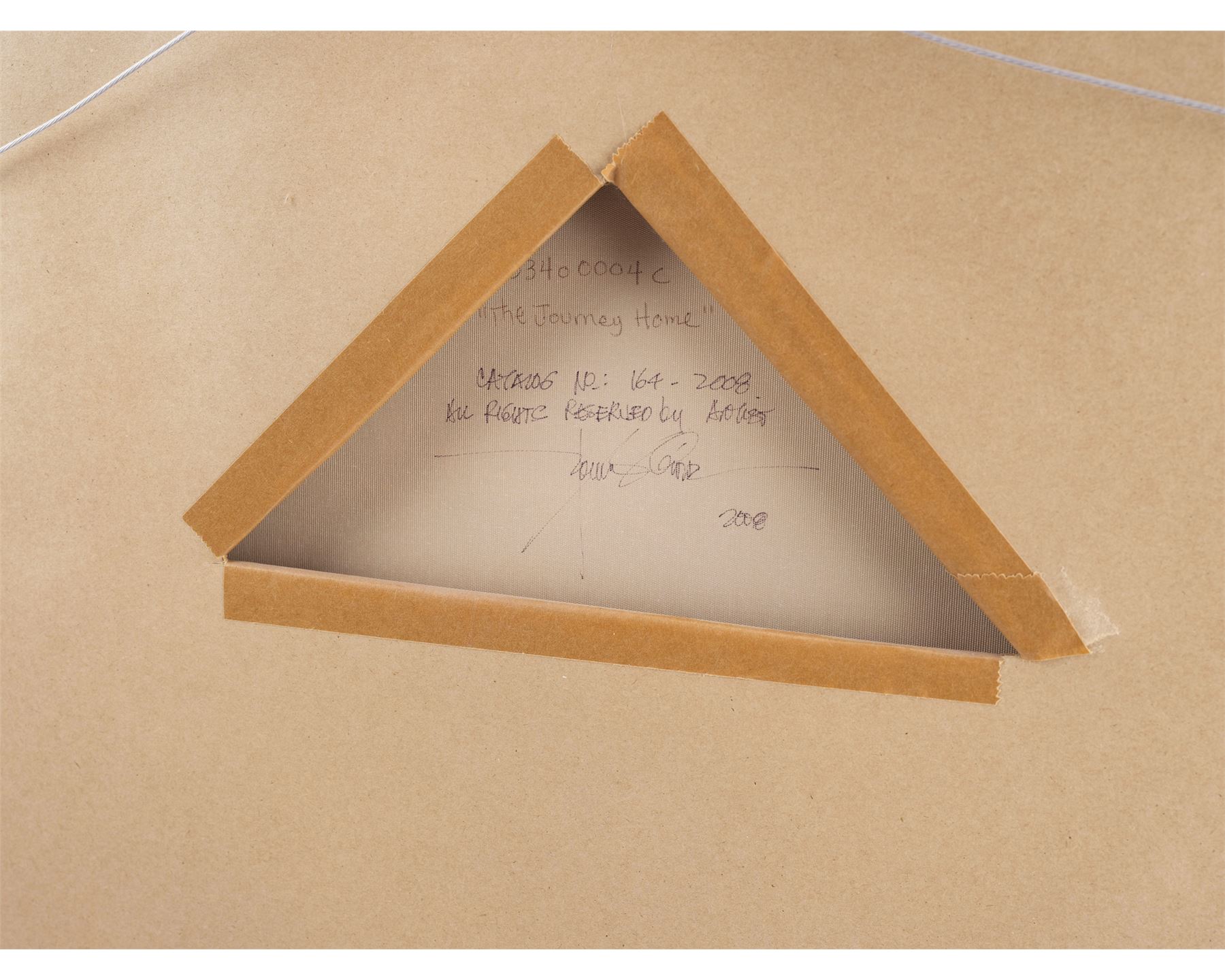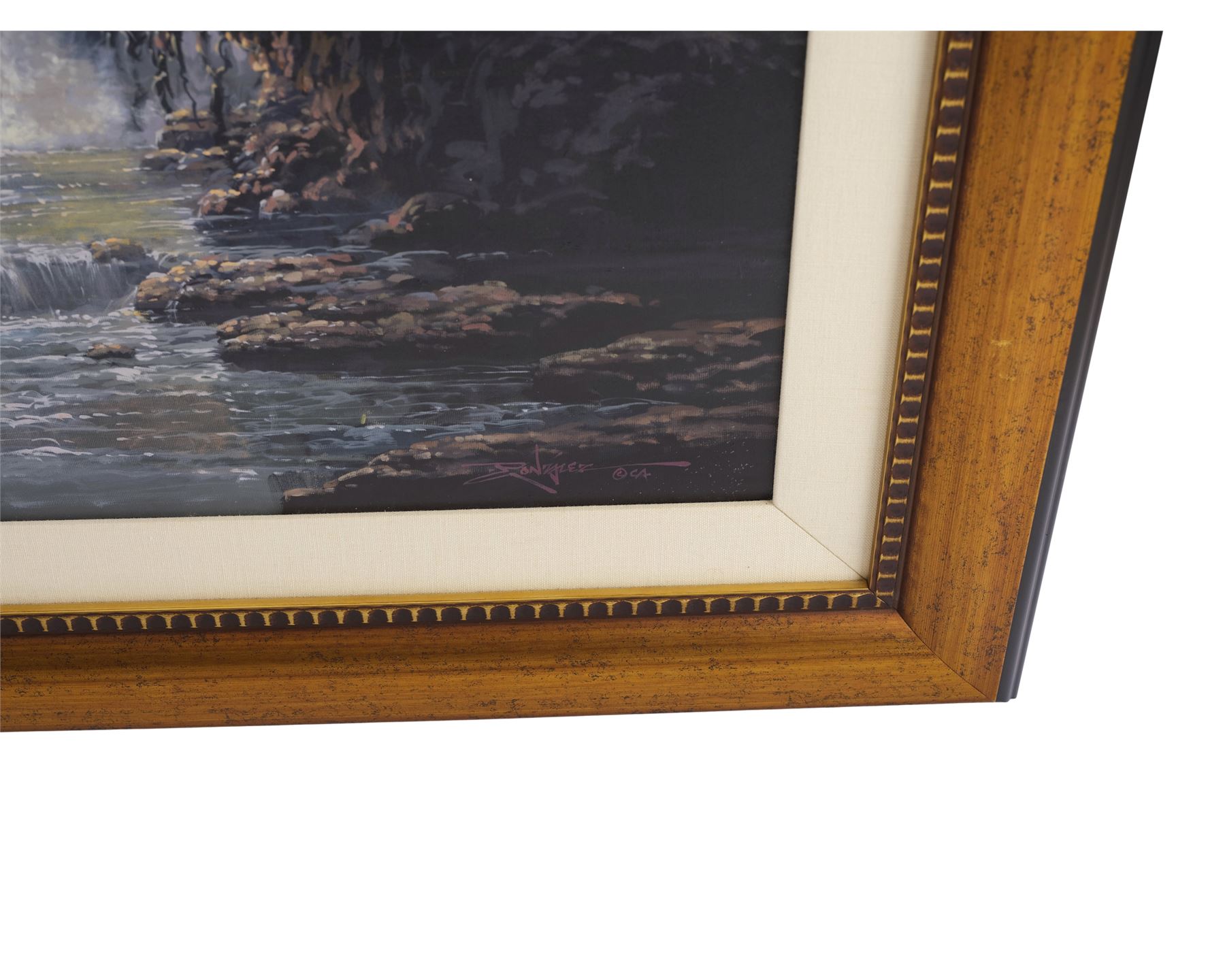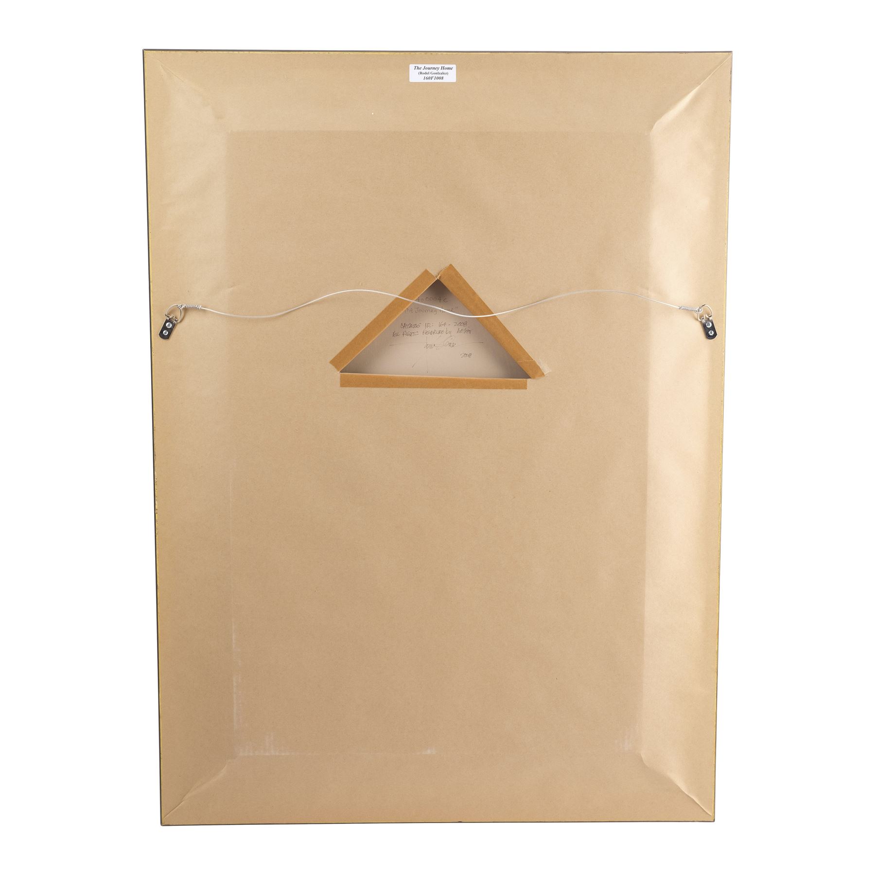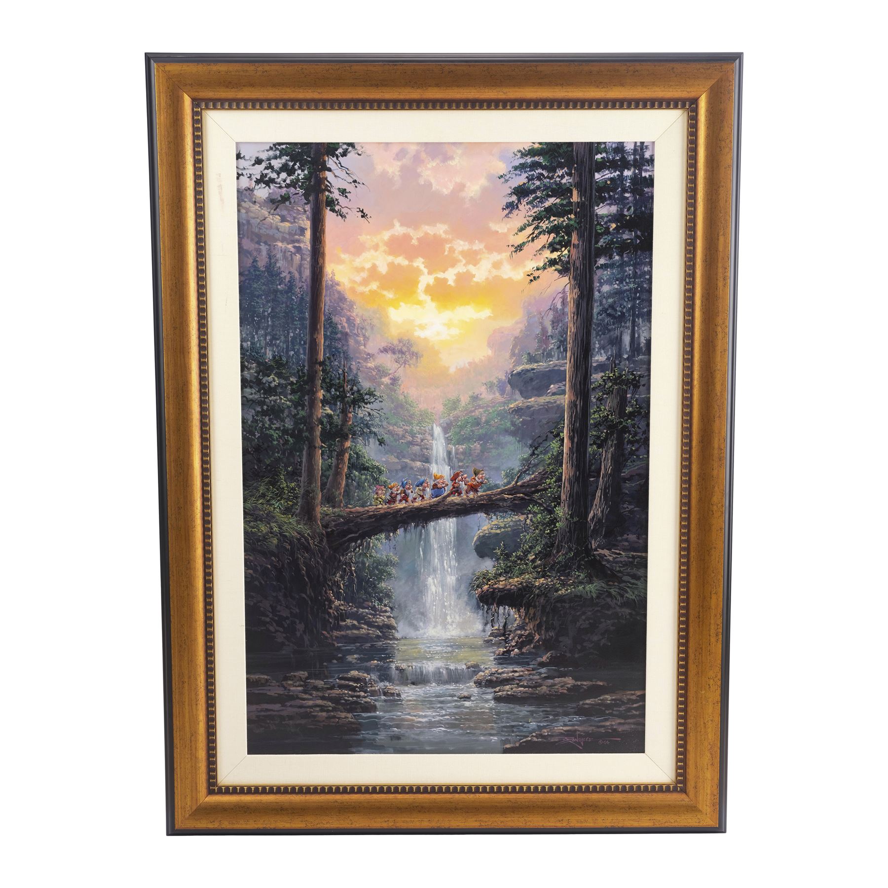 This 2008 painting based on a scene from the 1937 classic depicts the Seven Dwarfs crossing a fallen tree. It is rendered and signed by Gonzalez in oil on canvas and comes mounted inside a custom metal-lined wooden frame affixed with a hanging wire. An exposed panel on the back of the canvas is hand-marked with Disney Fine Art catalog number "164" and serial number "5340004c" as well as Gonzalez's copyright. The frame exhibits minor creasing to its construction paper backing. Dimensions: 33" x 45" x 2" (84 cm x 114.5 cm x 5 cm)