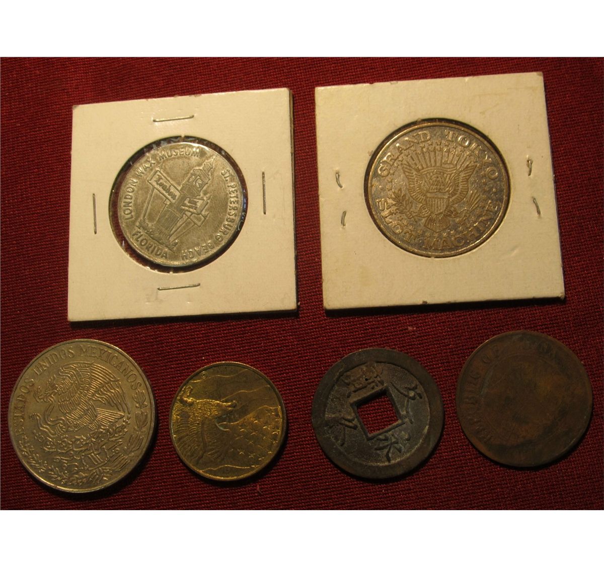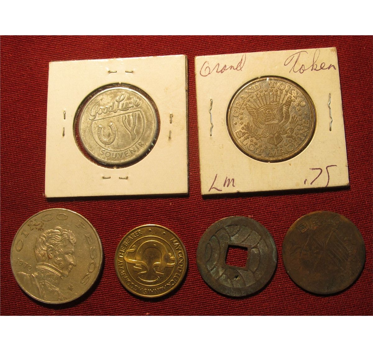 758. Grand Tokyo Slot Machine Token; London Wax Museum St. PetersBU rg Beach, Florida Token; "May Good Luck Always Accompany the Bearer Token; old Chinese or Korean Coin with a Square Hole in the Center; old Chinese Copper; & 1972 Mexico Five Peso.