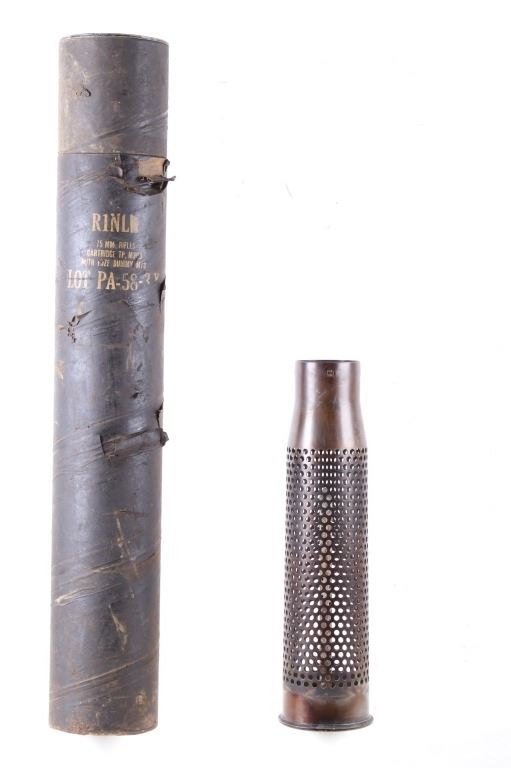 For your consideration is this 75MM Recoiless M309 Target Dummy Round. The 75mm recoilless rifle cartridge M309 was made in several variants. It basically was the standard HE (High Explosive) load with a PD (Point Detonating) Fuse, or a MTSQ (Mechanical Time Super Quick) Fuse. The M309 used a paper liner in the perforated cartridge case M31 or M31A1 while the M309A1 used a plastic liner. There were also a TP (Target Practice) M309A1 with only a small spotting charge in the projectile and also M309 or M309A1 TP with Inert Projectiles and paper or plastic liners respectively. The cartridge is in good condition; and should be noted the FUZE DUMMY is spent with primer already tripped, so this is not a live dummy round. This cartridge comes in a case with: R!NL: 75MM Rifles Cartridge TP, M309 with FUZE Dummy M73 Lot-PA-58-3y stamped on its cylindrical face. On the bottom is embossed 75MM Rifle Container M172, this is also embossed on its lid as well. Measurements of this shell are 16" x 4 1/4" diameter of primer base x 2 7/8" diamer of cartridge neck. Jeff