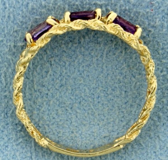 In 14K yellow gold, there are three 5x3mm oval amethyst gemstones. Size 6 1/2 1.7g