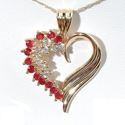 One-quarter carat (total weight) Diamonds and one-half carat (total weight) Rubies in a beautiful heart shaped pendant.</em></td>