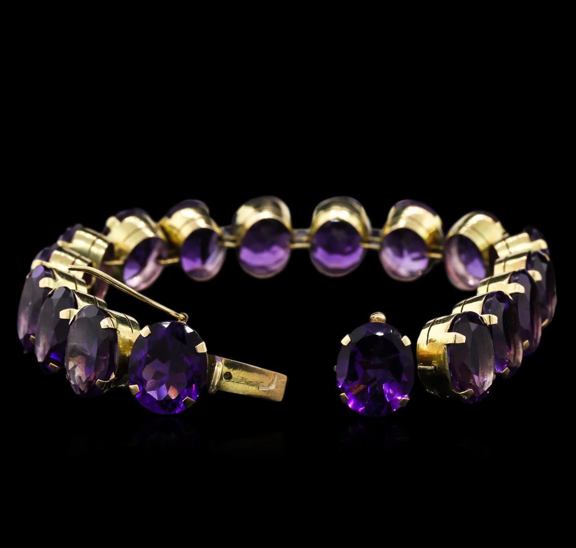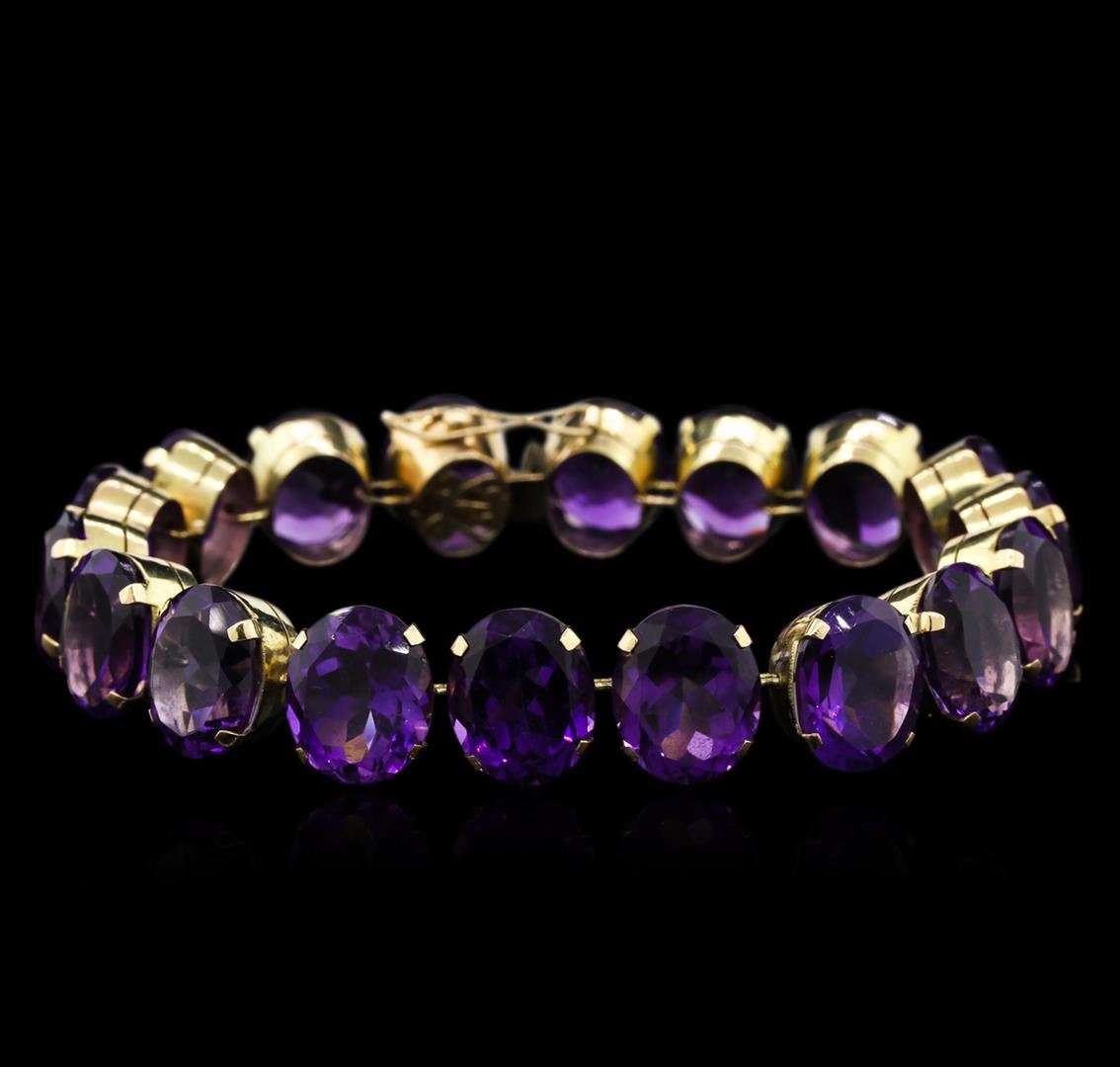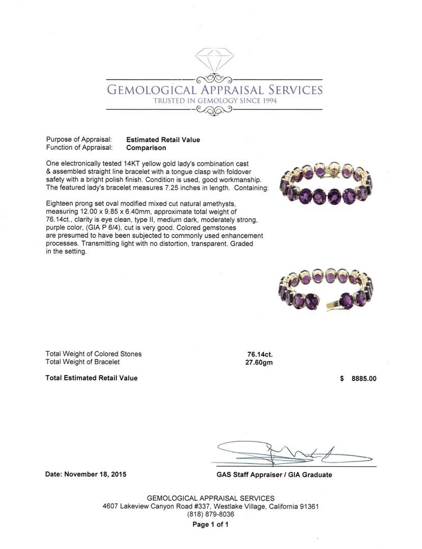 One electronically tested 14KT yellow gold lady's combination cast & assembled straight line bracelet with a tongue clasp with foldover safety with a bright polish finish. The featured lady's bracelet measures 7.25 inches in length. Condition is used, good workmanship. Containing: Eighteen prong set oval modified mixed cut natural amethysts, measuring 12.00 x 9.85 x 6.40mm, approximate. Total Weight of 76.14ct., clarity is eye clean, type II, medium dark, moderately strong, purple color, (GIA P 6/4), cut is very good. Colored gemstones are presumed to have been subjected to commonly used enhancement processes. Transmitting light with no distortion, transparent. Graded in the setting. Total Weight of Colored Stones 76.14ct. Total Weight of Bracelet 27.60gm. GAS Appraised.
