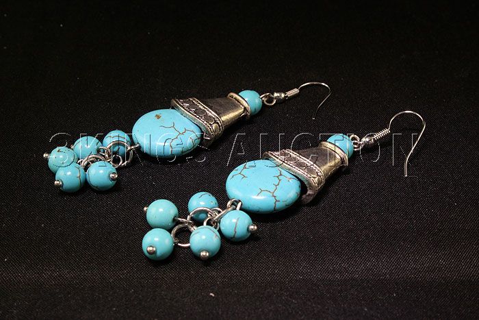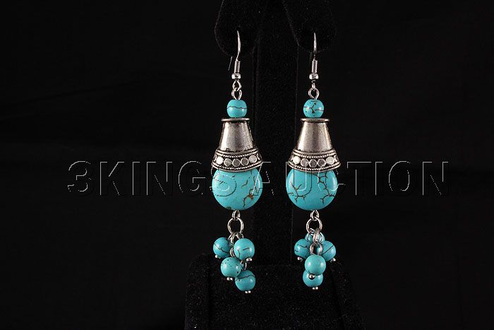 76.83ctw Dangling Turquoise Silver Earring **|**|** 2" Natural Blue Turquoise Silver Hook Dangling Earring with Tibetan Silver Cone ; MSRP: $300