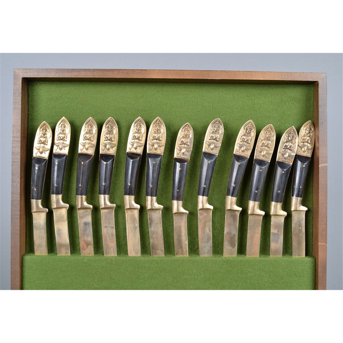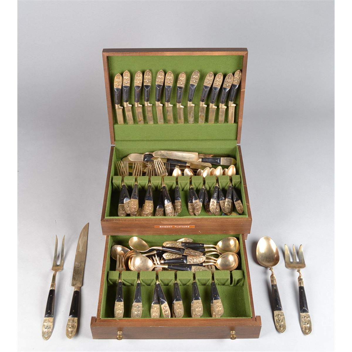 Of probably water buffalo horn and brass, includes 12 dinner knives, 12 dinner forks, 12 tea spoons, 12 soup spoons, 12 salad forks, 12 butter knives, and four large serving utensils, in a fitted velvet lined box. Circa early 20th century. Private collection Southfield, MI.