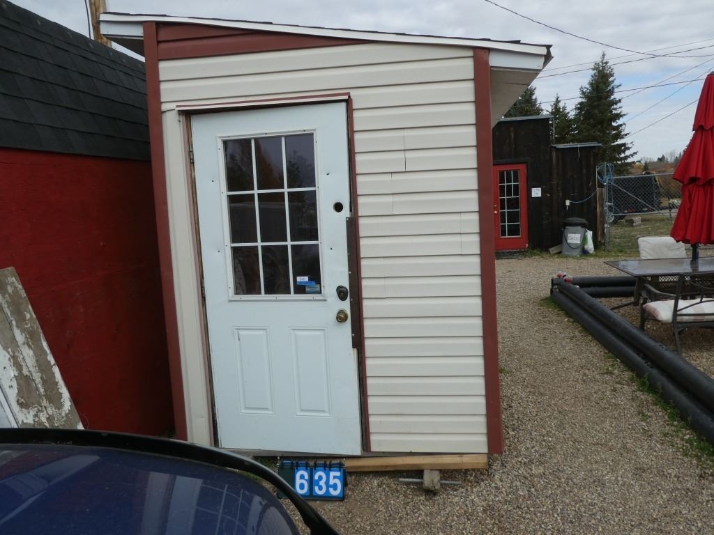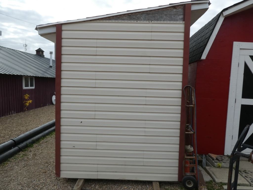 Vinyl Outside siding, shingles on roof, no window, Insulated door with glass insert. Buyer Responsible for Loading and Removal