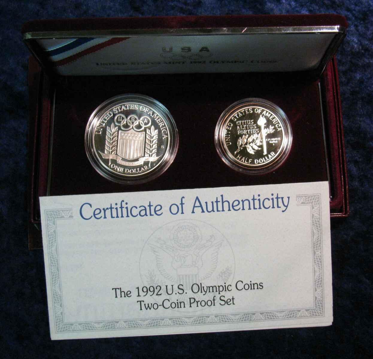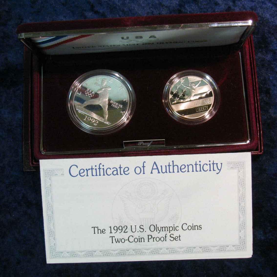 761. 1992 S Olympics Two-Piece Silver Proof Set. Baseball player & Gymnast. Original as issued with Certificate of Authenticity.