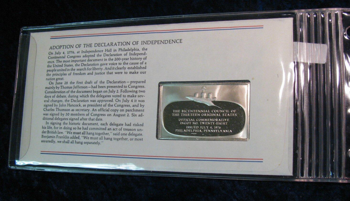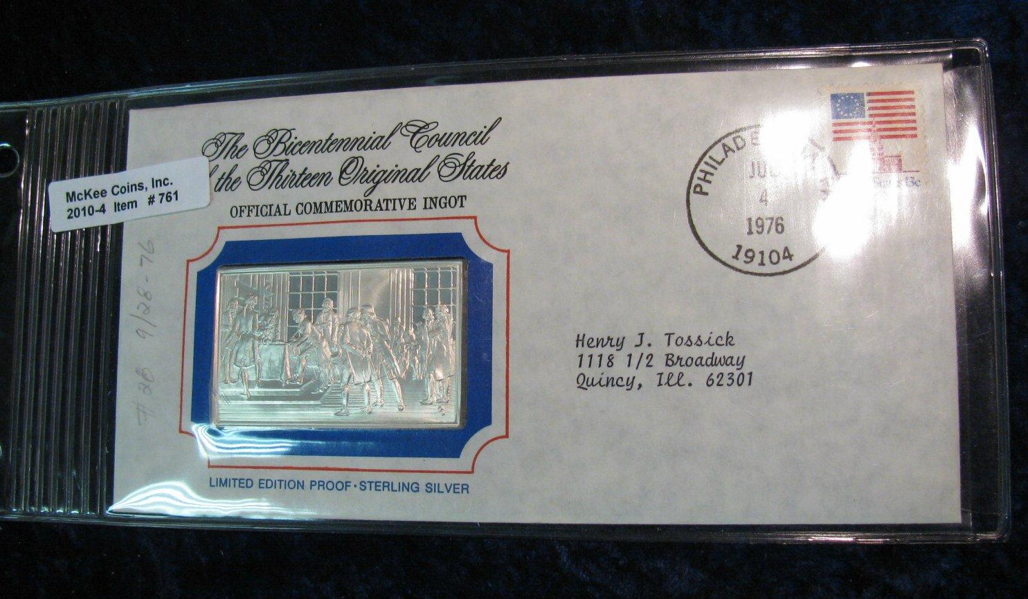 761. Sterling Silver Limited Edition Proof No. 28 Ingot. The Bicentennial Council of the Thirteen Original States.
