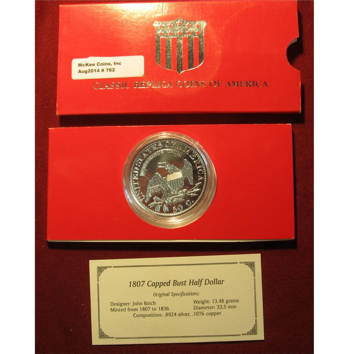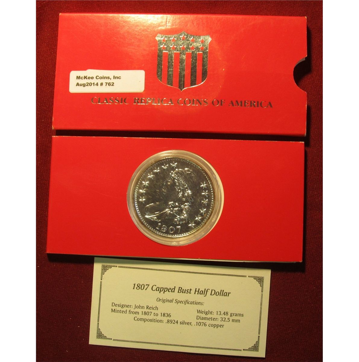 762. Large size 1807 Capped BustHalf Dollar Copy in holder, plated in .999 Fine Silver.