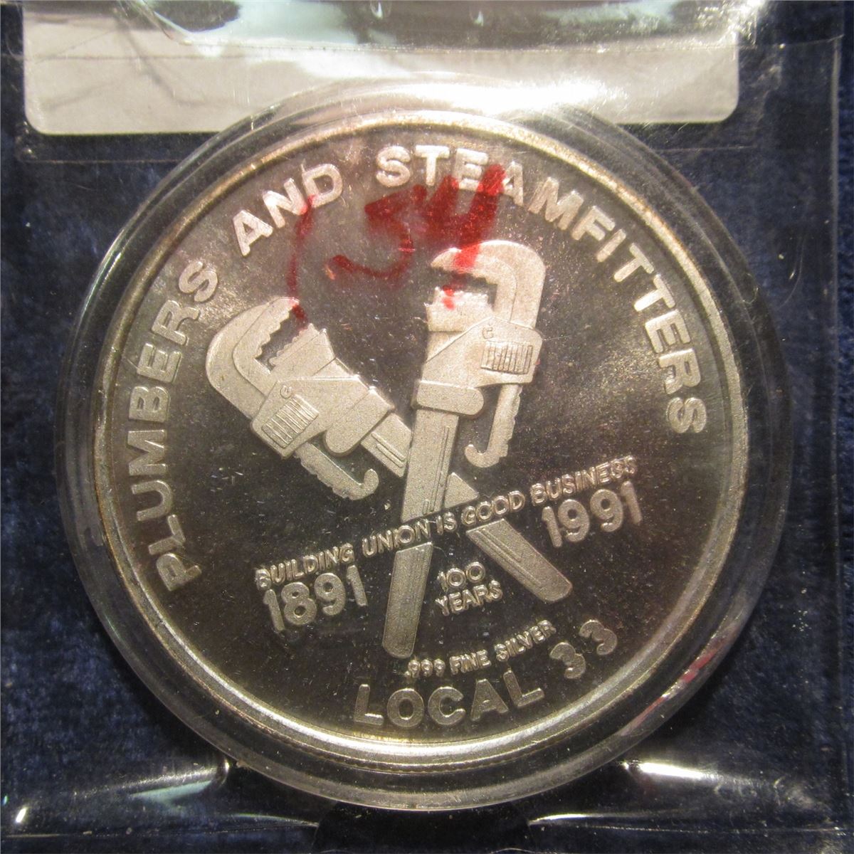 767. 1891-1991 "Plumbers and Steamfitters Local 33" One Ounce .999 Fine Silver Round. Encapsulated.