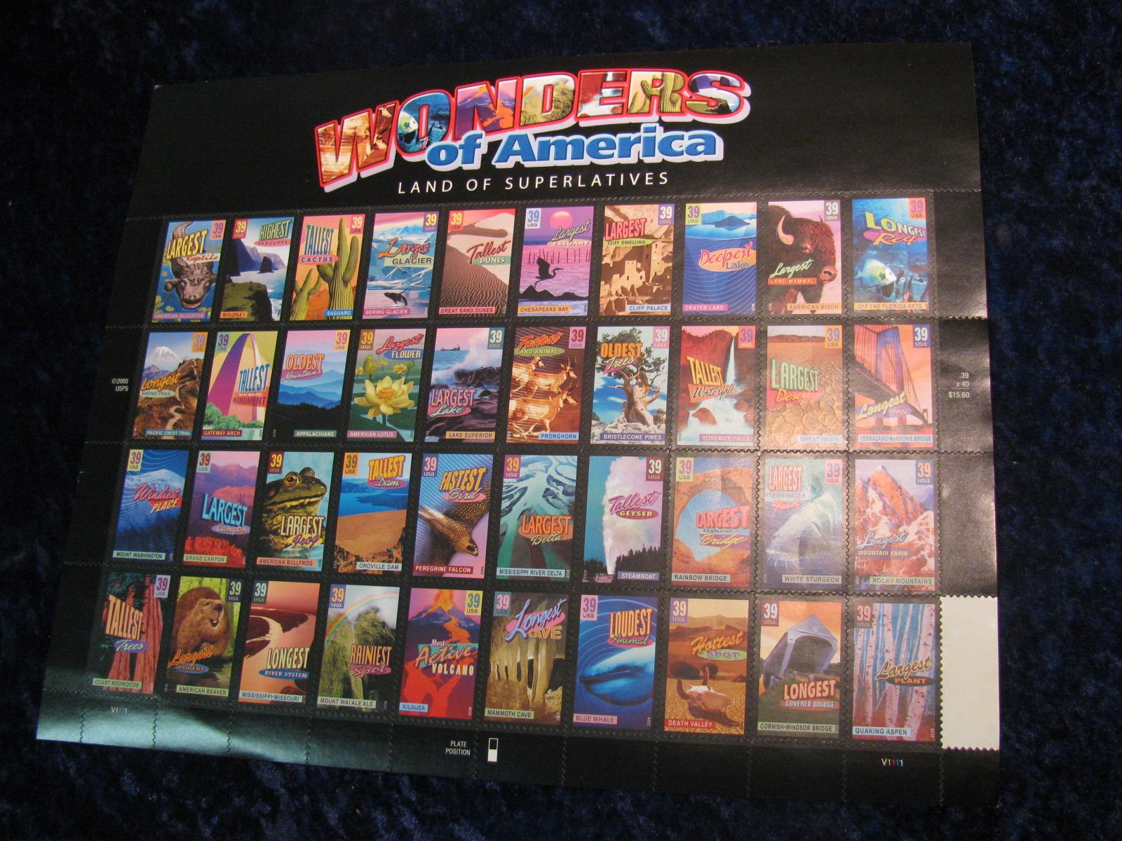 767. Wonders of America Land of Superlatives Mint Sheet of .39c U.S. Stamps. Missing small area at lower right corner. Face value $15.60.