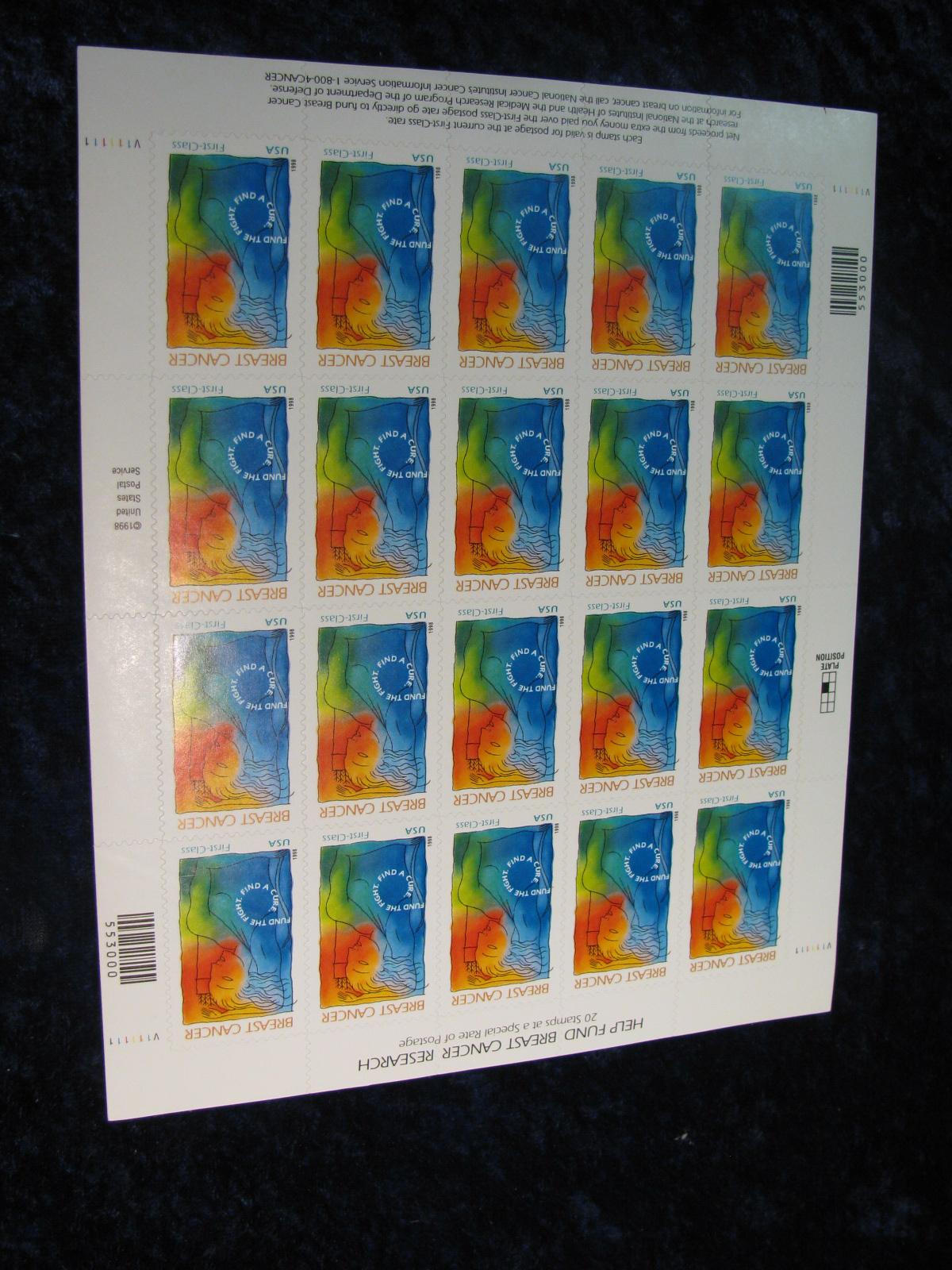 768. Mint Plate block of "Breast Cancer" U.S. Stamps. (20) stamps at current First-class rate. The balance went to the fund to fight breast cancer.