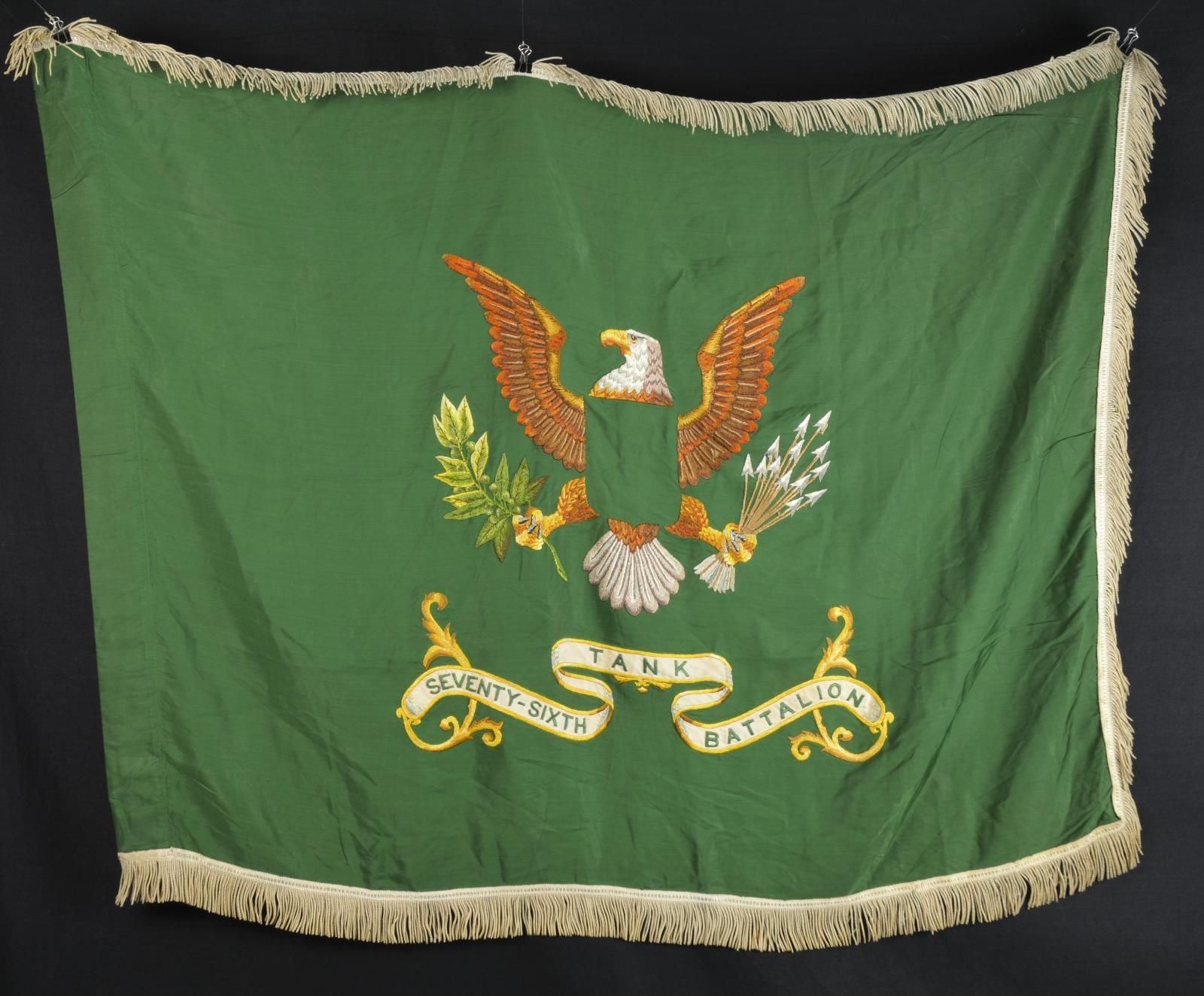 The flag of the 76th Tank Battalion is green which became the official color for the armor branch in circular 49 on 21 February 1947. When the Cavalry branch was abolished, the present Armor was assigned the former Cavalry color yellow by SR 600-60-1 dated 26 October 1951. The unit tab featured paratrooper wings placed over the triangular three color symbol of armor.