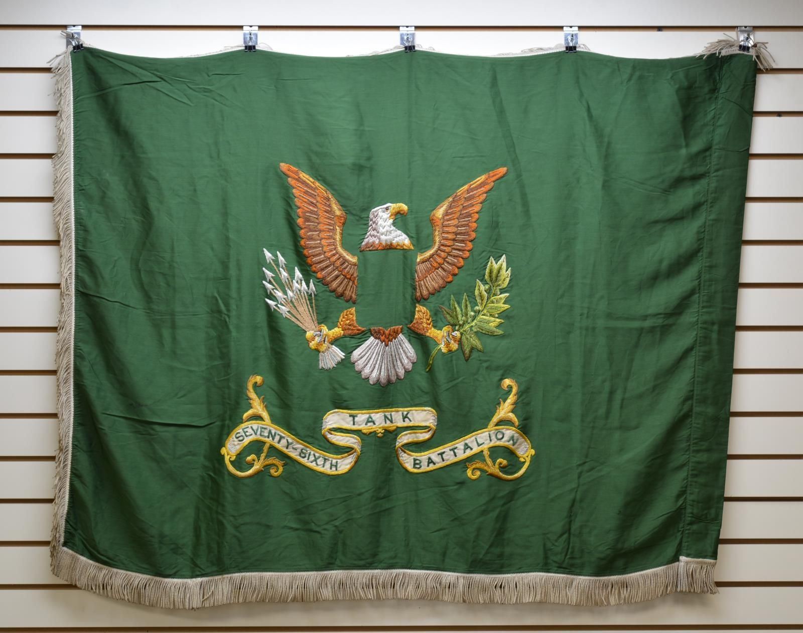 3’ x 4’ embroidered on green field, circa 1950. 76th Tank Battalion this battalion was part of 11th Airborne Division between 1953 and 1963. 11th Airborne was formed in World War Two and served in the Pacific in particular the Philippines where men from the division participated in the famous raid to free Allied civilian prisoners of the Japanese held at the Los Banos camp.