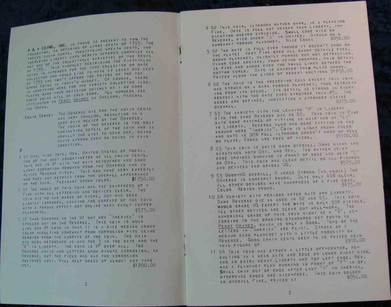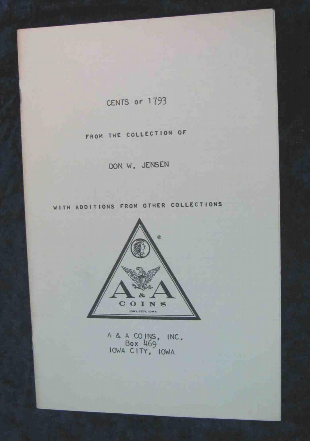 77. "Cents of 1793" From the Collection of Don W. Jensen Mint Catalog from A & A Coins, Inc. Iowa City, Iowa Catalog. Lists prices of this set ranging from $110 to $2,200.00 or you could buy the whole collection of 53 pieces for $31,510.00.