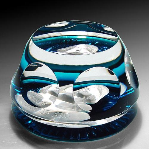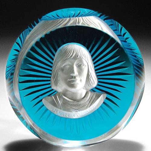 Franklin Mint and Baccarat 1976 collaboration faceted Joan of Arc sulphide paperweight, with a white cameo of the Maid of Orleans, on sunburst-cut translucent blue ground. Six and one facets, and footed base. Signed/dated. From the Great Leaders of History series. Includes certificate of authenticity, biography, and original presentation box. Diameter 2 7/8". NO RESERVE
