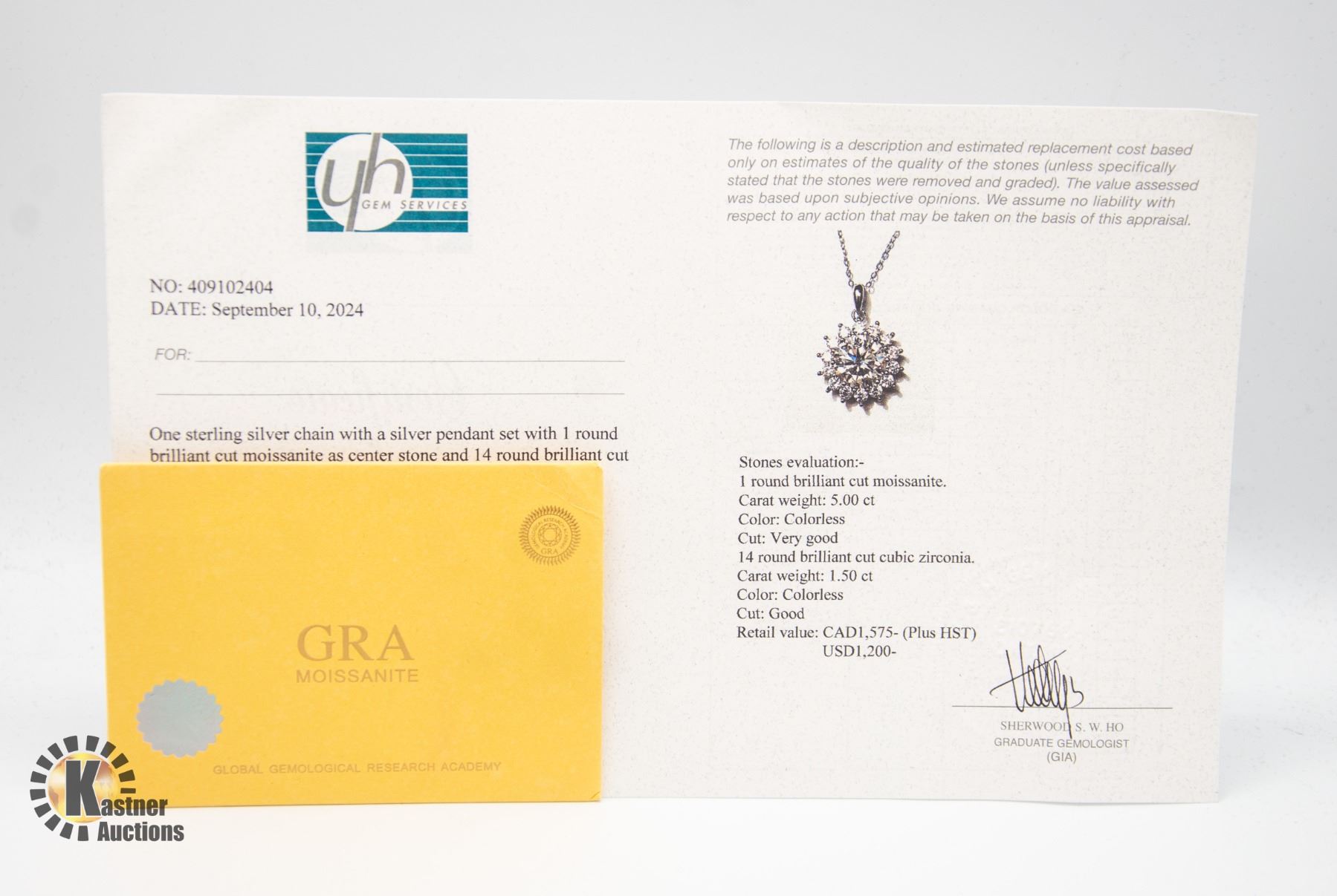 CUT MOISSANITE STONE VVS D COLOR SET IN CENTER SET IN 925 SILVER PENDANT RETAIL VALUE $1,575.00 **ALL ITEMS MUST BE REMOVED BY 5PM SATURDAY, OCTOBER 19TH 2024. ALL REMAINING ITEMS WILL BE SUBJECT TO A $6.00 PER DAY STORAGE CHARGE. ANY ITEMS REMAINING AFTER MONDAY, NOVEMBER 4TH 2024 WILL BE CONSIDERED FORFEITED. NO REFUNDS WILL BE ISSUED FOR FORFEITED ITEMS. TO SCHEDULE A PICK UP APPOINTMENT CLICK HERE