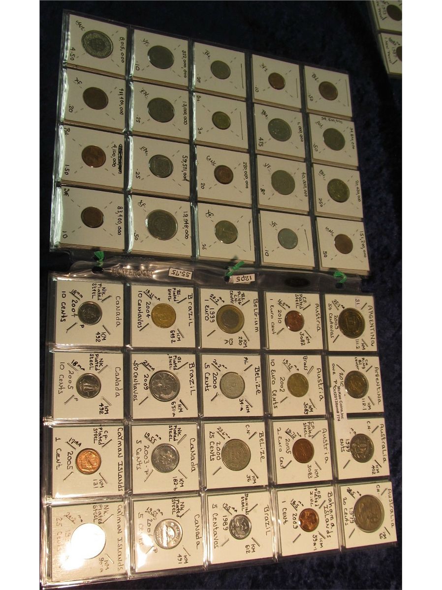 774. (100) World Coins from 43 different countries. All identified in 2" x 2"s & plastic pages. KM value $55.75.